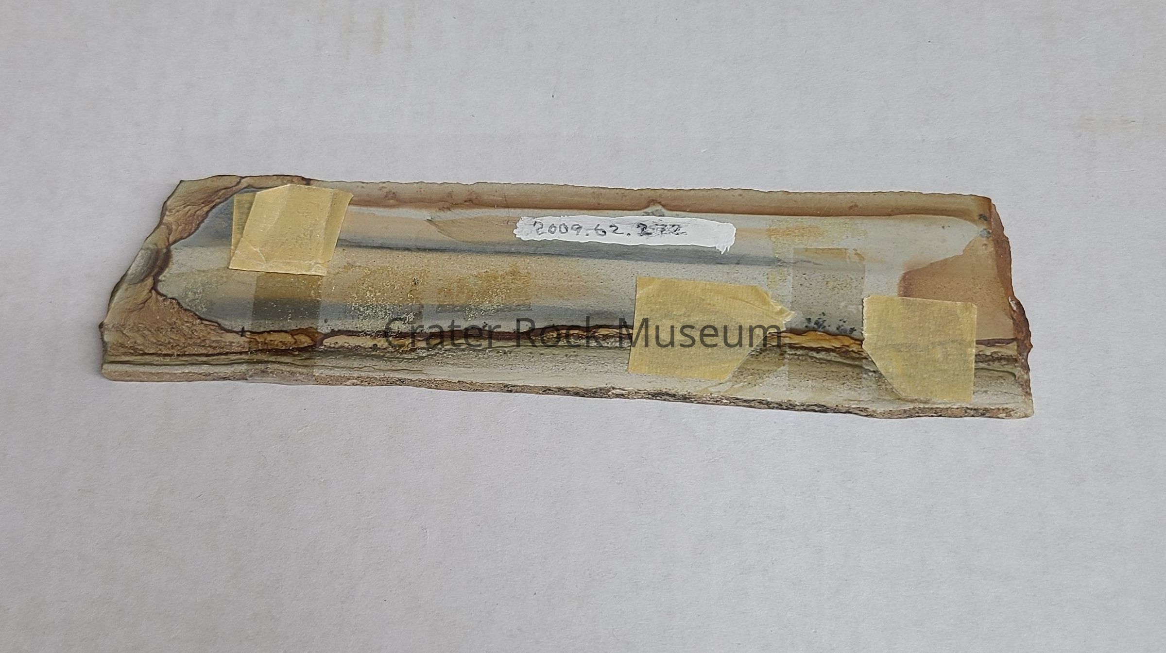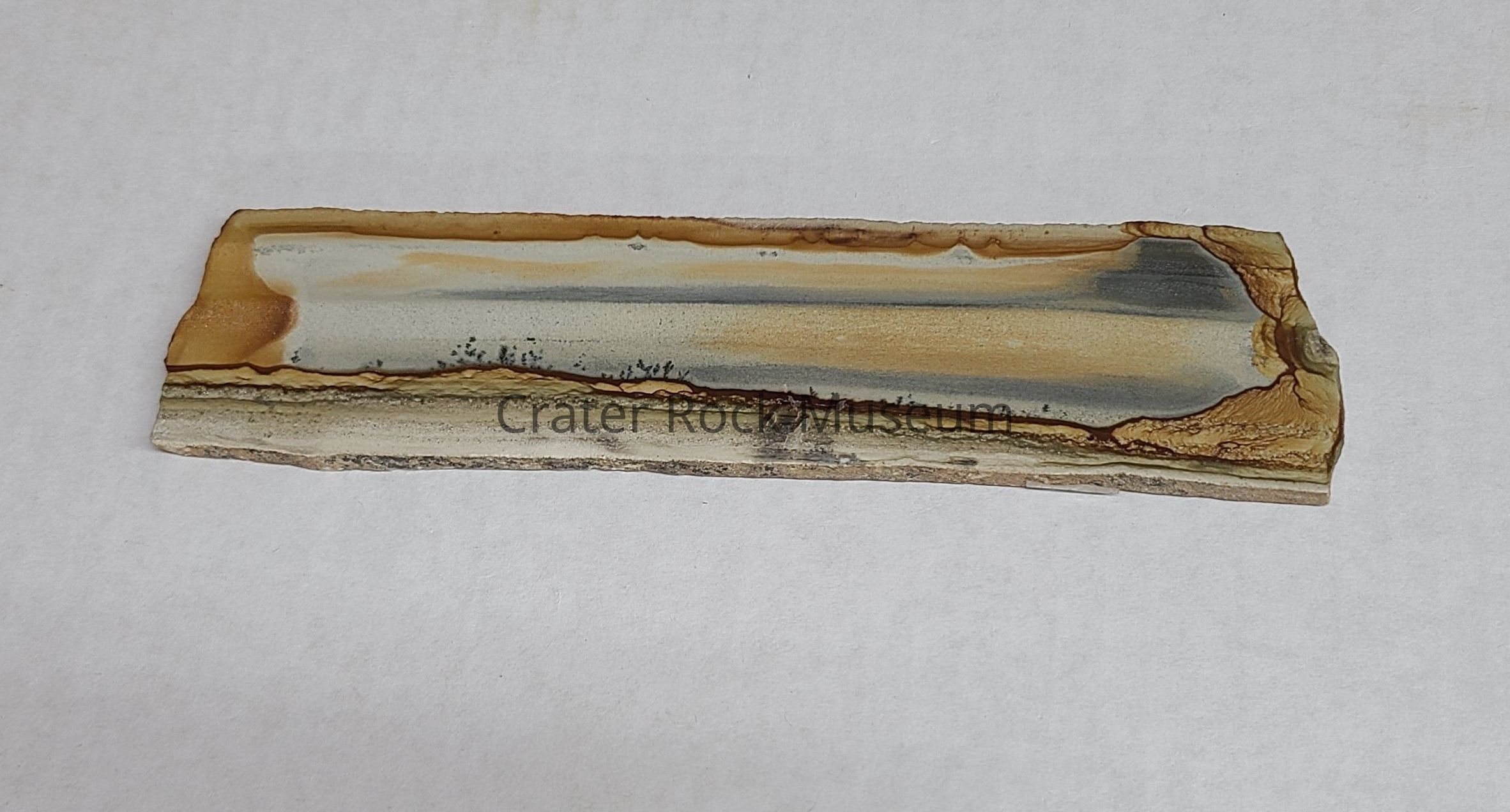 Description: Thin slab with polished face. White to dull green banded foreground and a dark red band on leading edge. Light blue and tan center section (sky) with a tan and burnt red border surrounding the upper portion.Collection