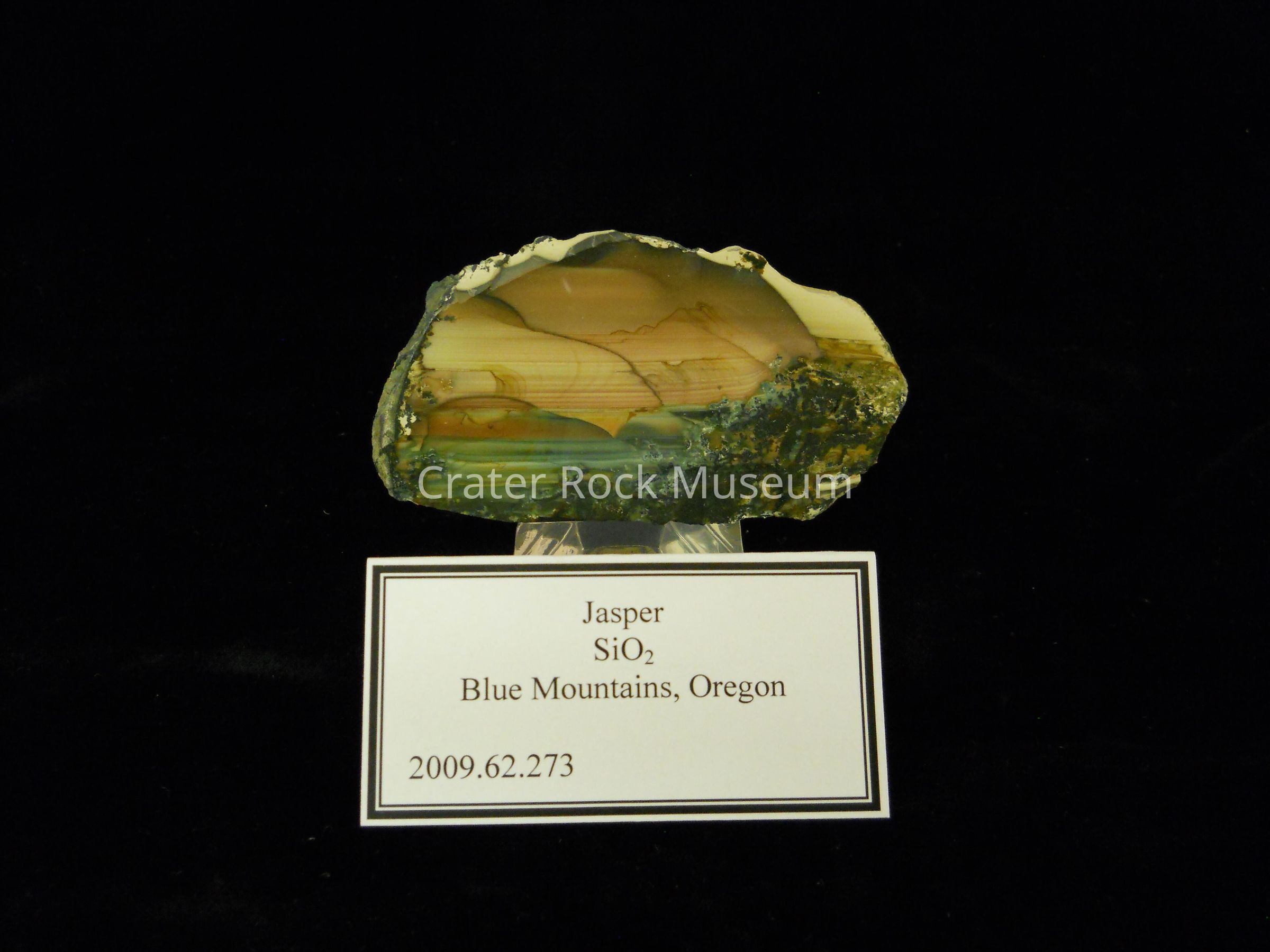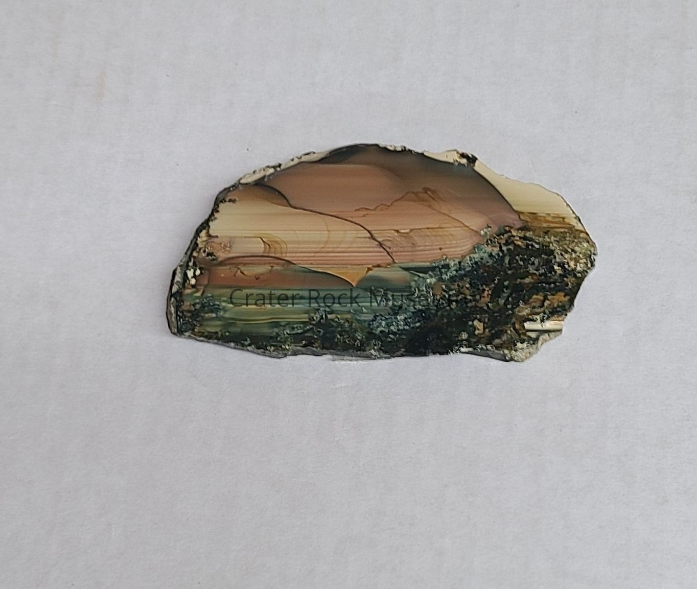 Description: Thin slice with polished face. Black and dark brown spotted foreground with green and blue banded layers adjacent to it. Dull red, tan, and brown layered (rolling hills) with small patch of light tan area in upper corner (sky).Collection