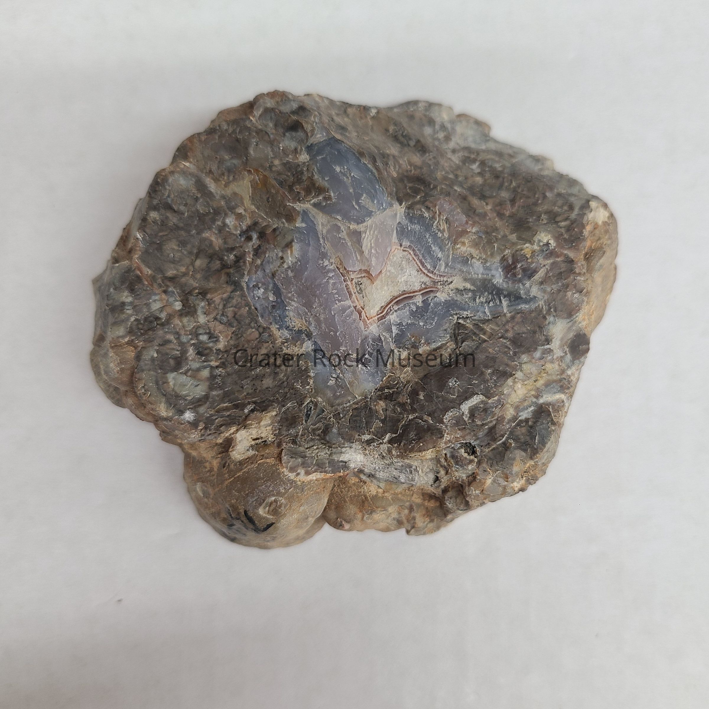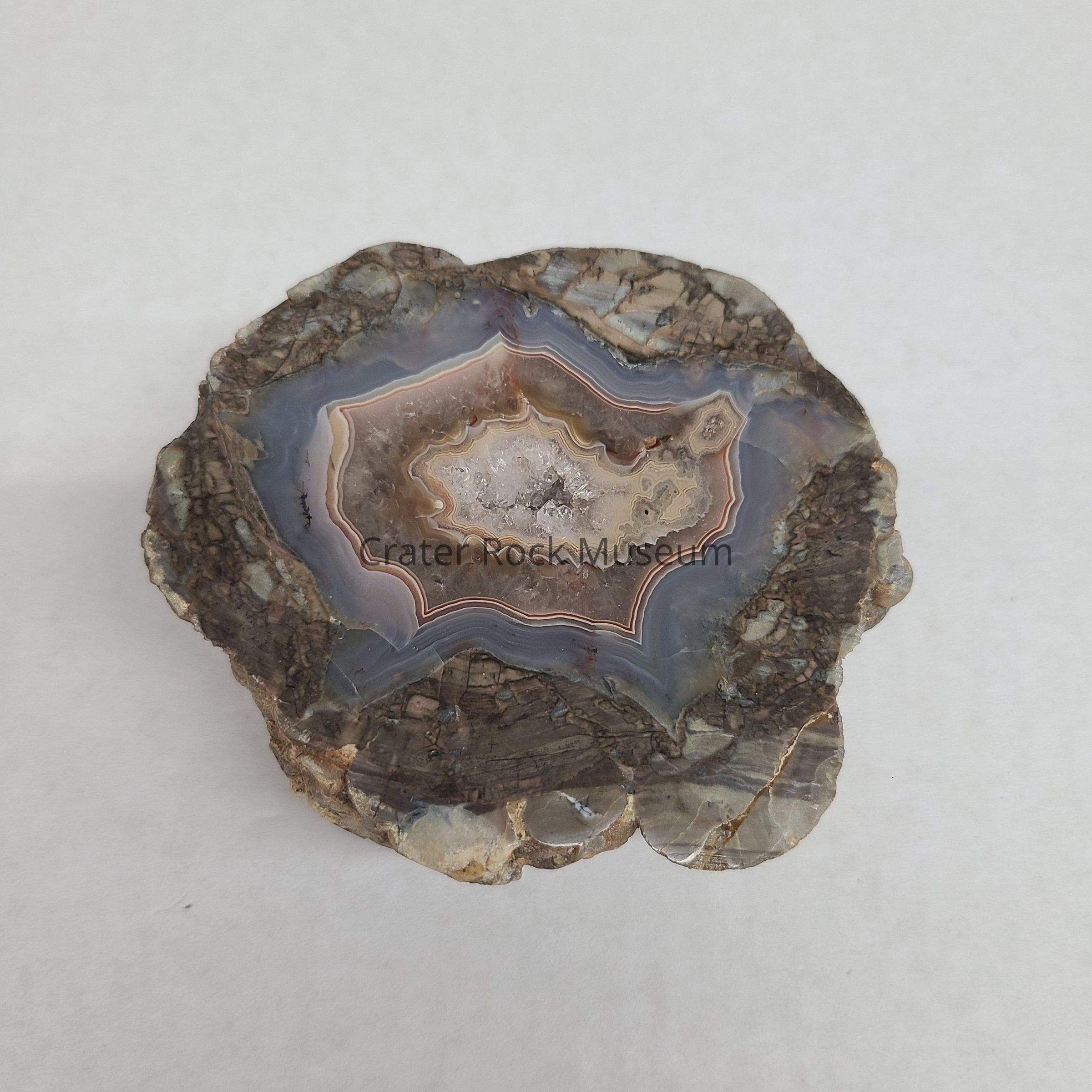 A Thunderegg from Deming, NM. Cut side shows Crystalline center surrounded by fortified Agate in Pinks, Reds, Creams, Crystalline and Blue. Surrounding rock is in Greys and Pinks.Dimensions