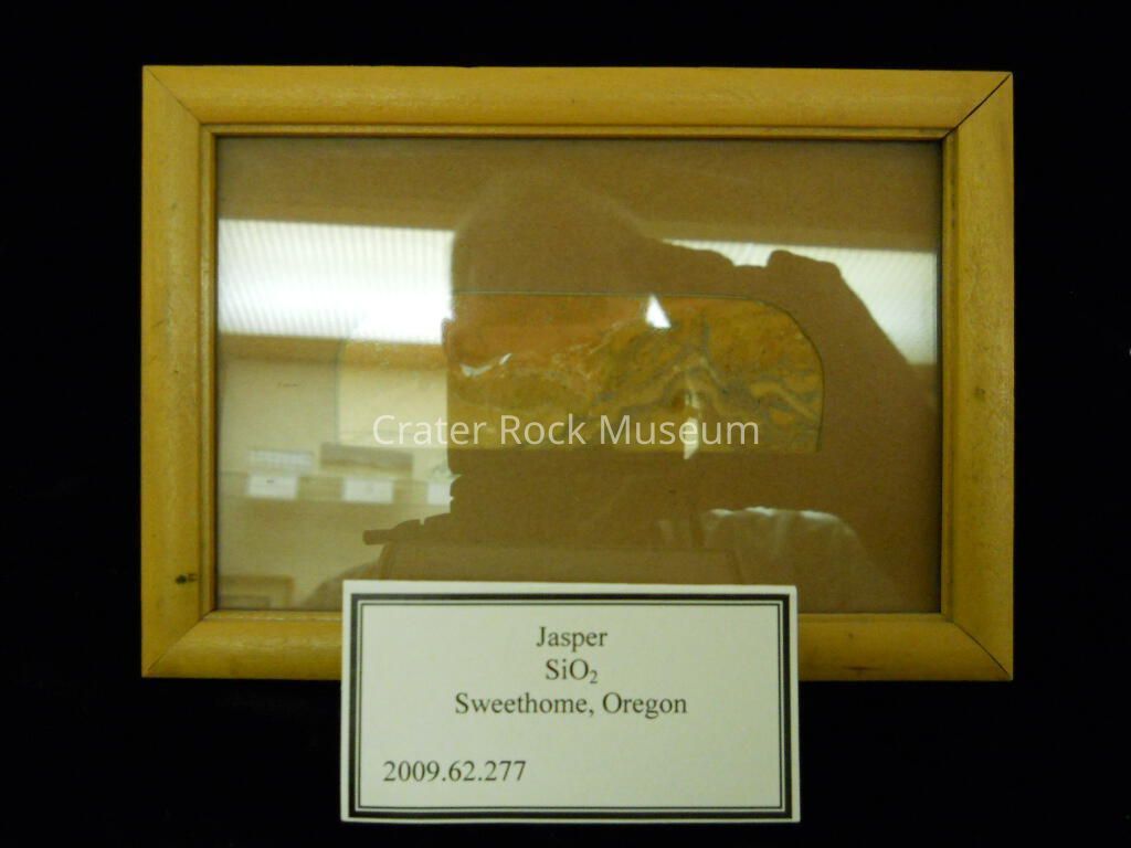 Description: Thin slab with polished face. Dull red and yellow with some tan and brown. Some banding. (In picture frame.)