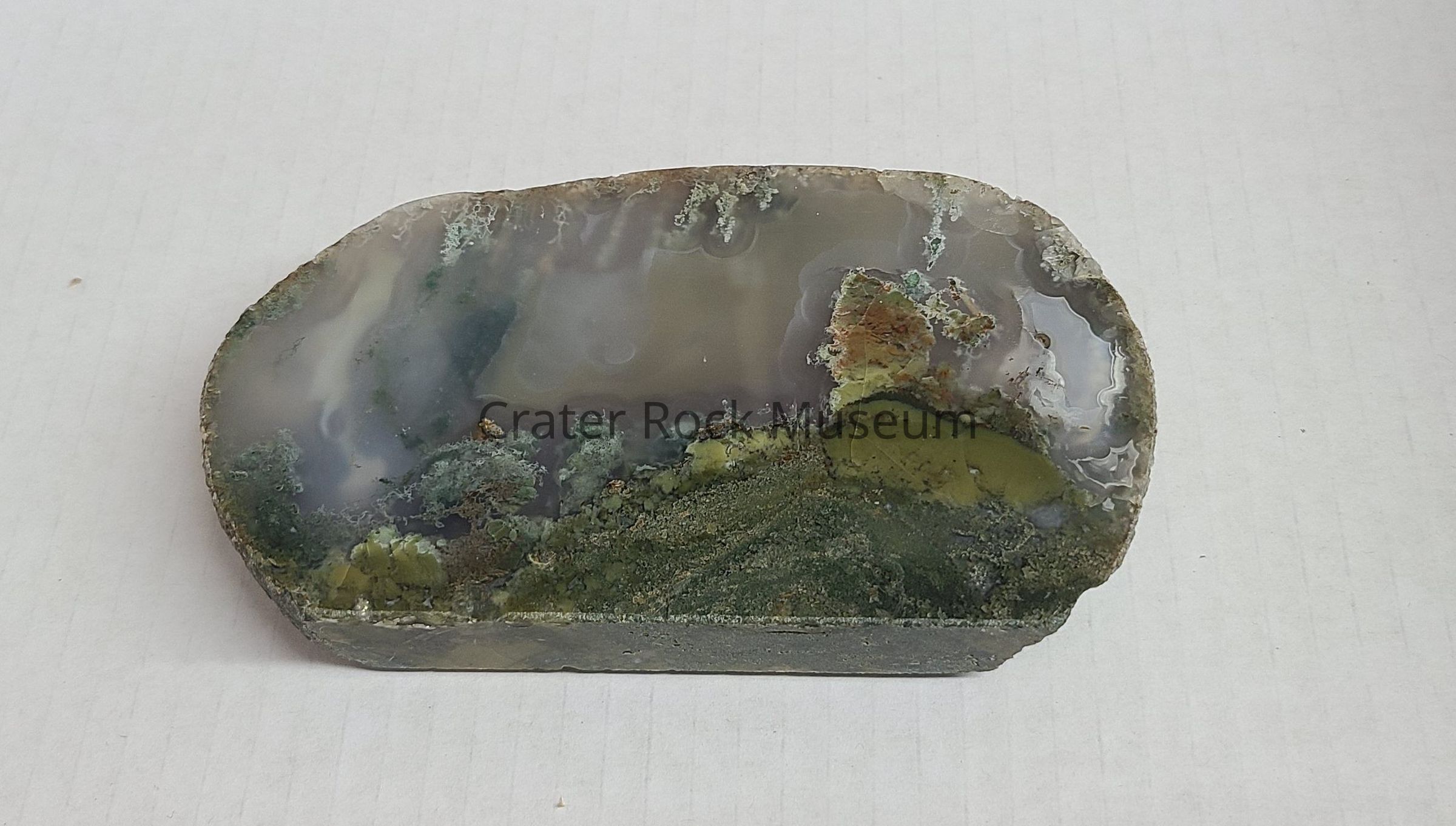 Description: Thick slab with polished face. Translucent olive green and blue on bottom with transparent blue, gray, and some white with some areas of dendritic structure on outside edges, running inwards.