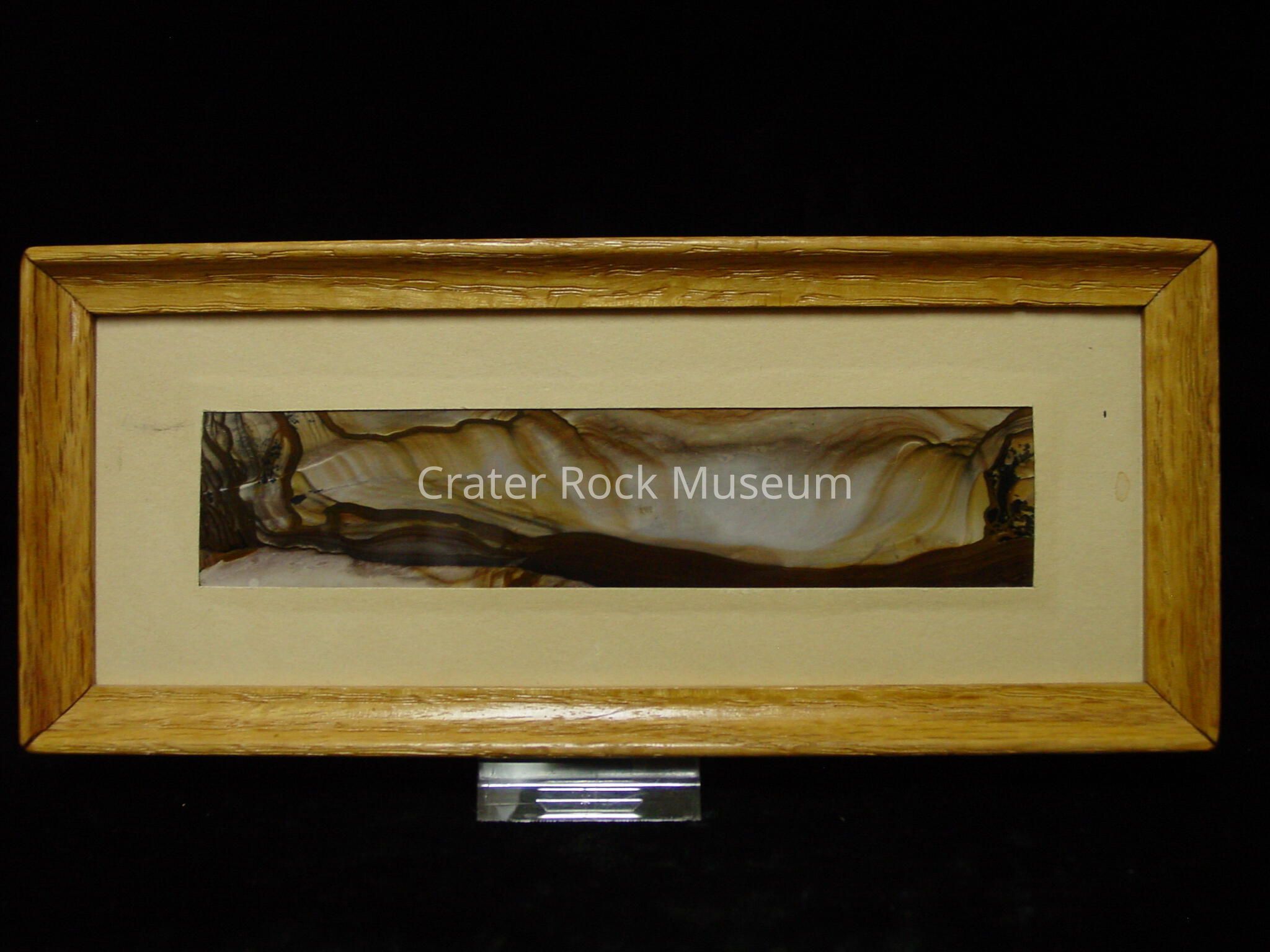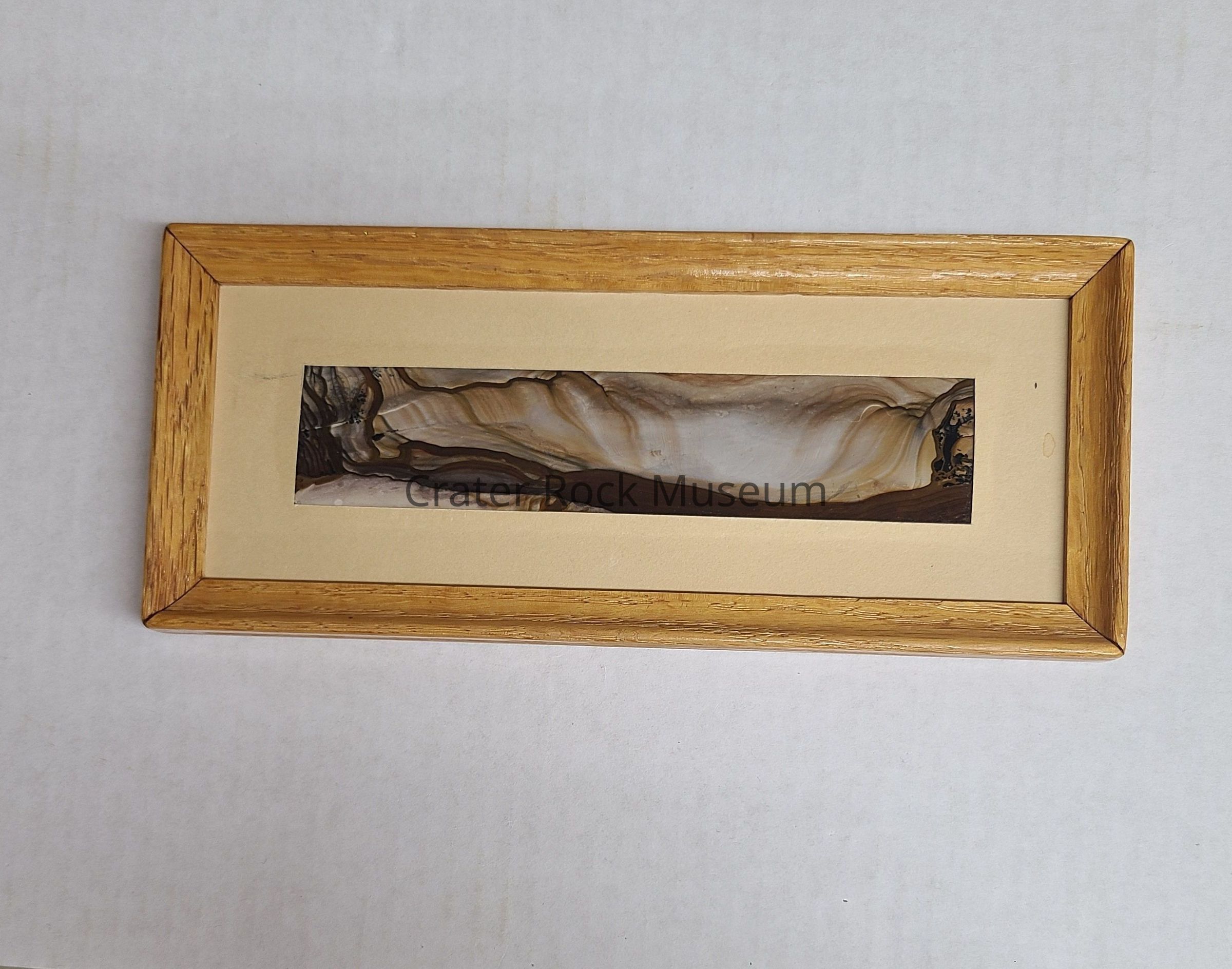 Description: Thin slab with polished face. Dark brown band at bottom with a creamy white, tan, and brown 'rolling hills' effect on top. Piece is mounted in a wooden frame and resembles a large hole or crater in the ground. Colors: beiges,browns and greys with some dendrite at each end.Collection