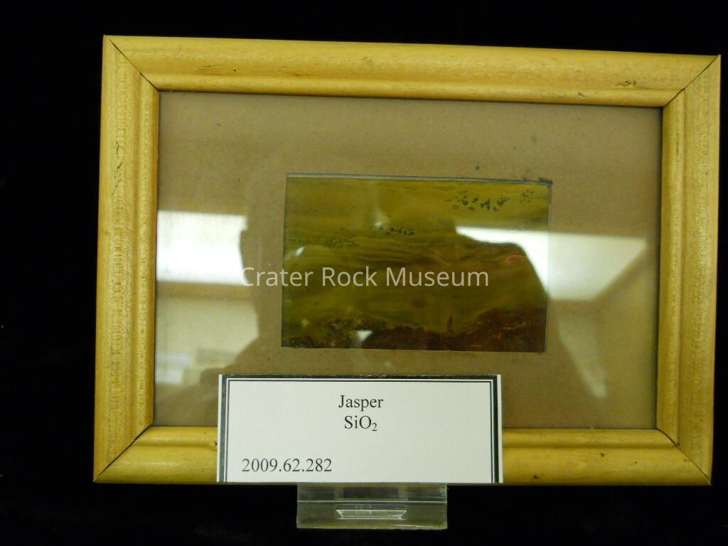 Description: Slab resembles a picture of a wide olive green valley with brown shadows and a few pinkish highlights viewed from above a deep reddish brown hill or mountain on bottom side of slab. Note: Small blots of blue appear to be ink marks on slab and matting. (In picture frame.)