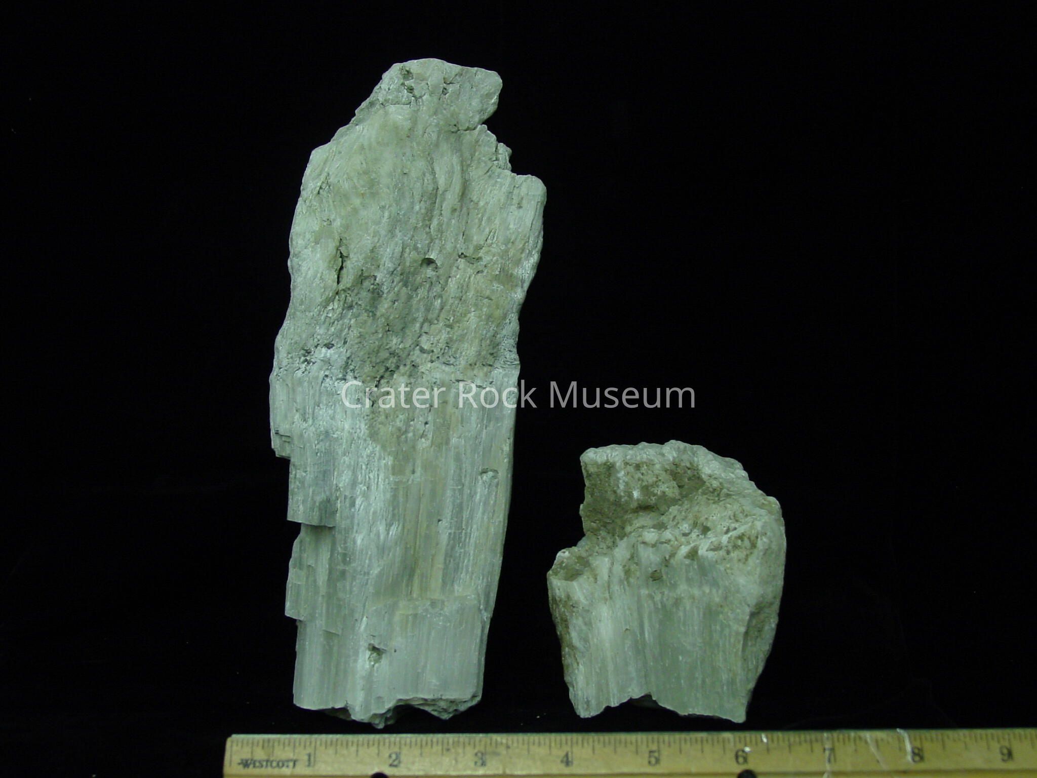 Desription: Two pieces of Borax. One is a long, slab like grayish piece. The other is more of a block. Both have a long vertical grain.