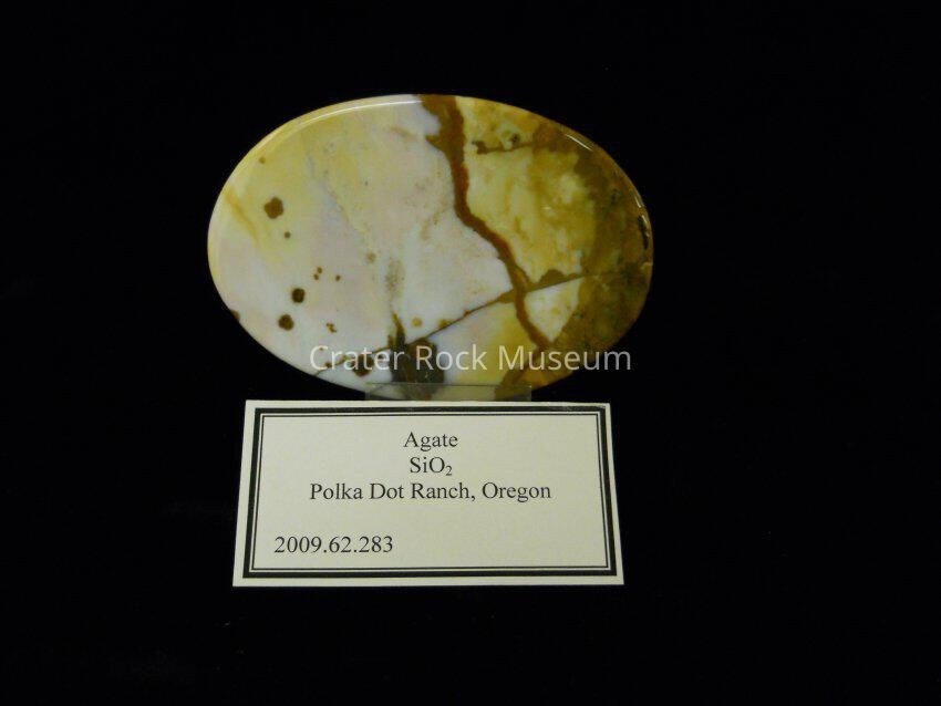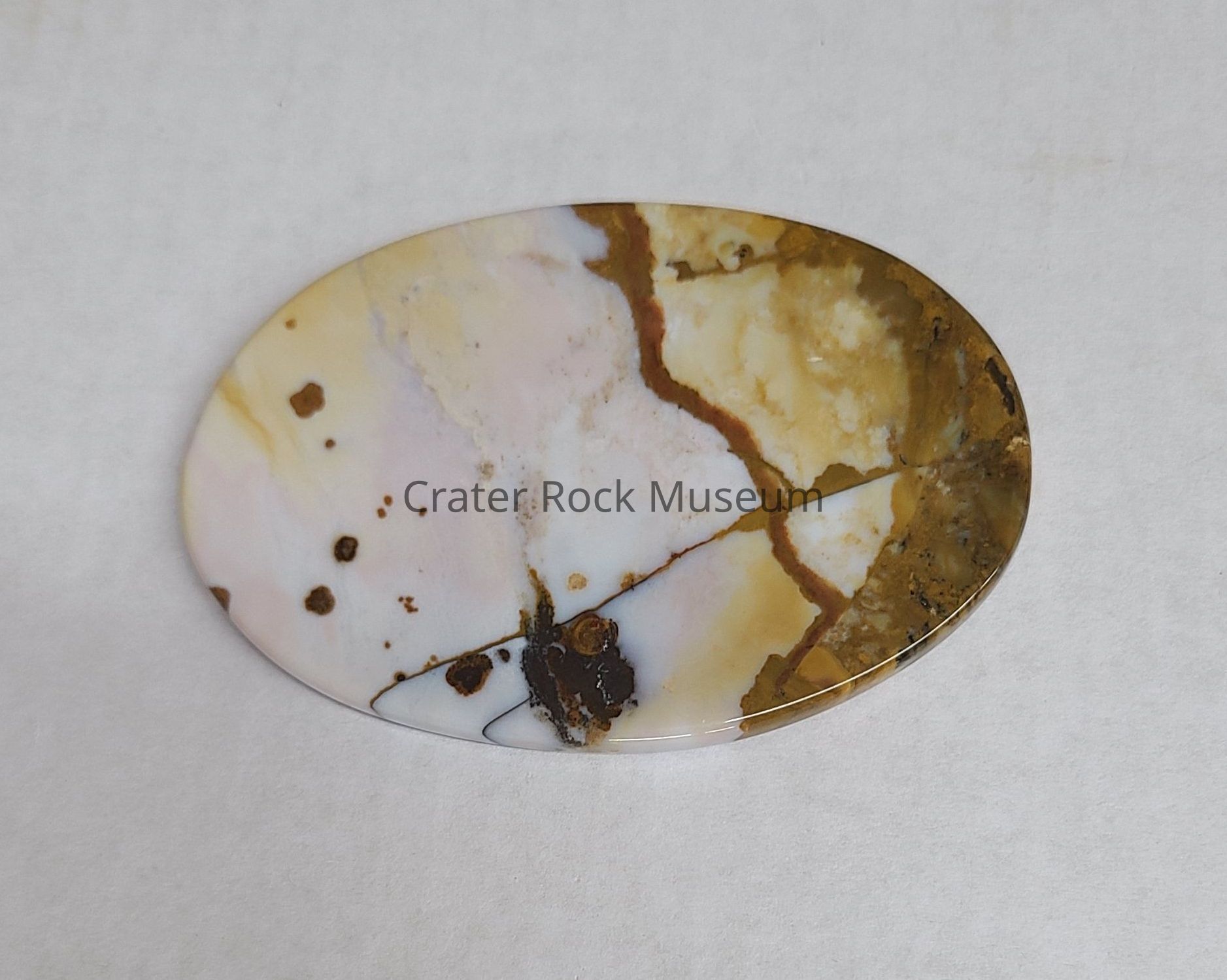 Description: Polished egg-shaped specimen with earthy brown bottom edge, a reddish-brown striation climbing across from lower left to center right. Background consists of pastel pinks, golds, and off-white with blots of reddish-brown and dark charcoal gray.Collection