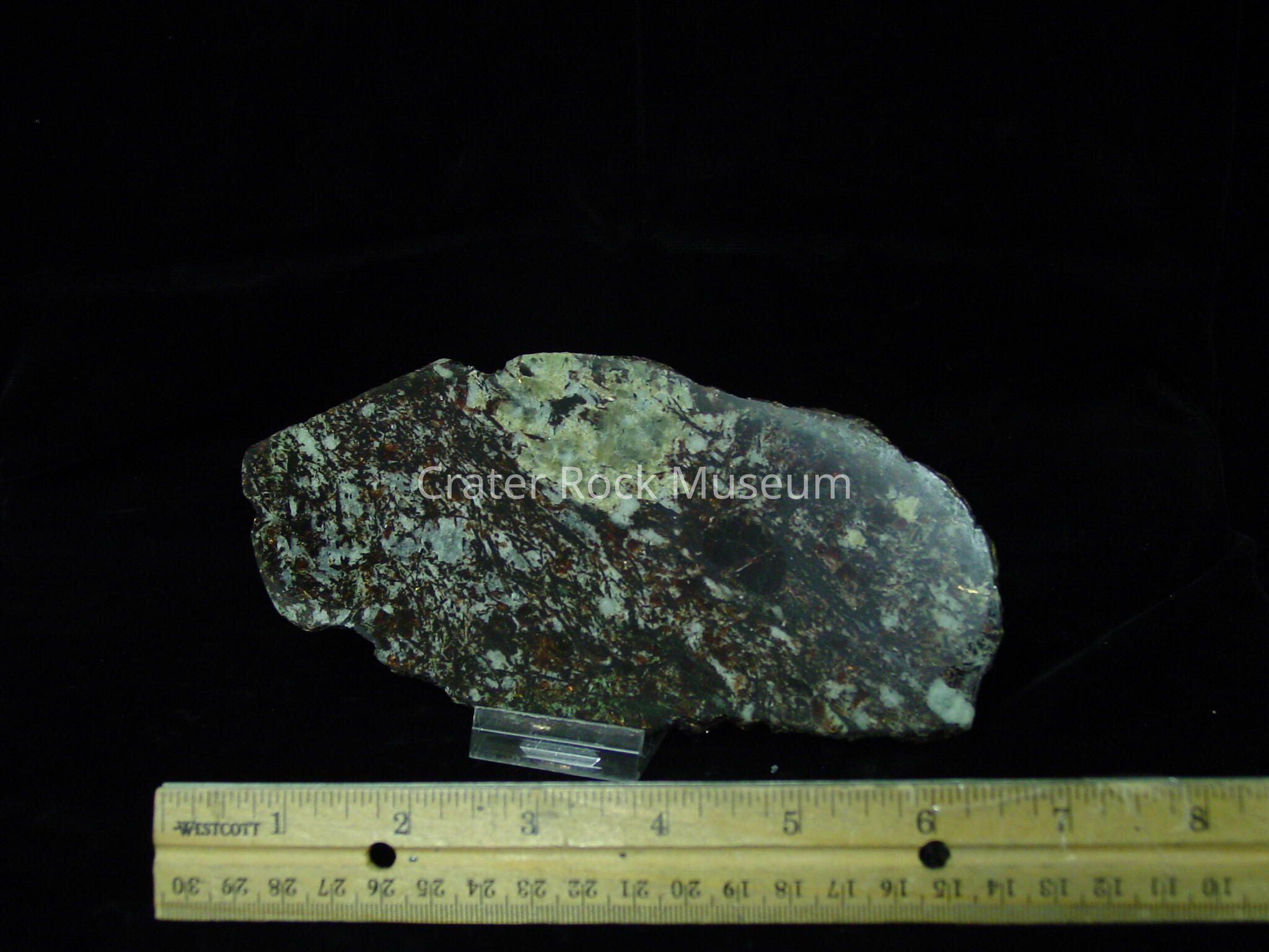 Description: This is a thin slab of brown and gray mineral with flecks of brassy colored mettalic