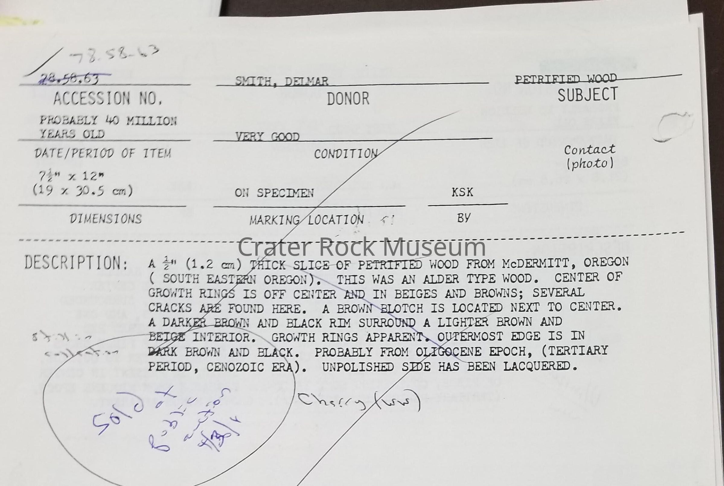 A 1.2 cm thick slice of petrified Alder wood from McDermitt, Oregon (SE Oregon). Off-centered growth rings and is beiges and brown; several cracks are found here. A brown blotch is located next to the center. A darker brown and black rim surround a lighter brown and beige interior. Growth rings apparent. Outer most edge is dark brown and black. Probably from the Oligocene epoch, Tertiary period, Cenozoic era (~40 mya). Unpolished side has been lacquered. (Sold in public auction, date has been written over and year illegible, see image).Collection