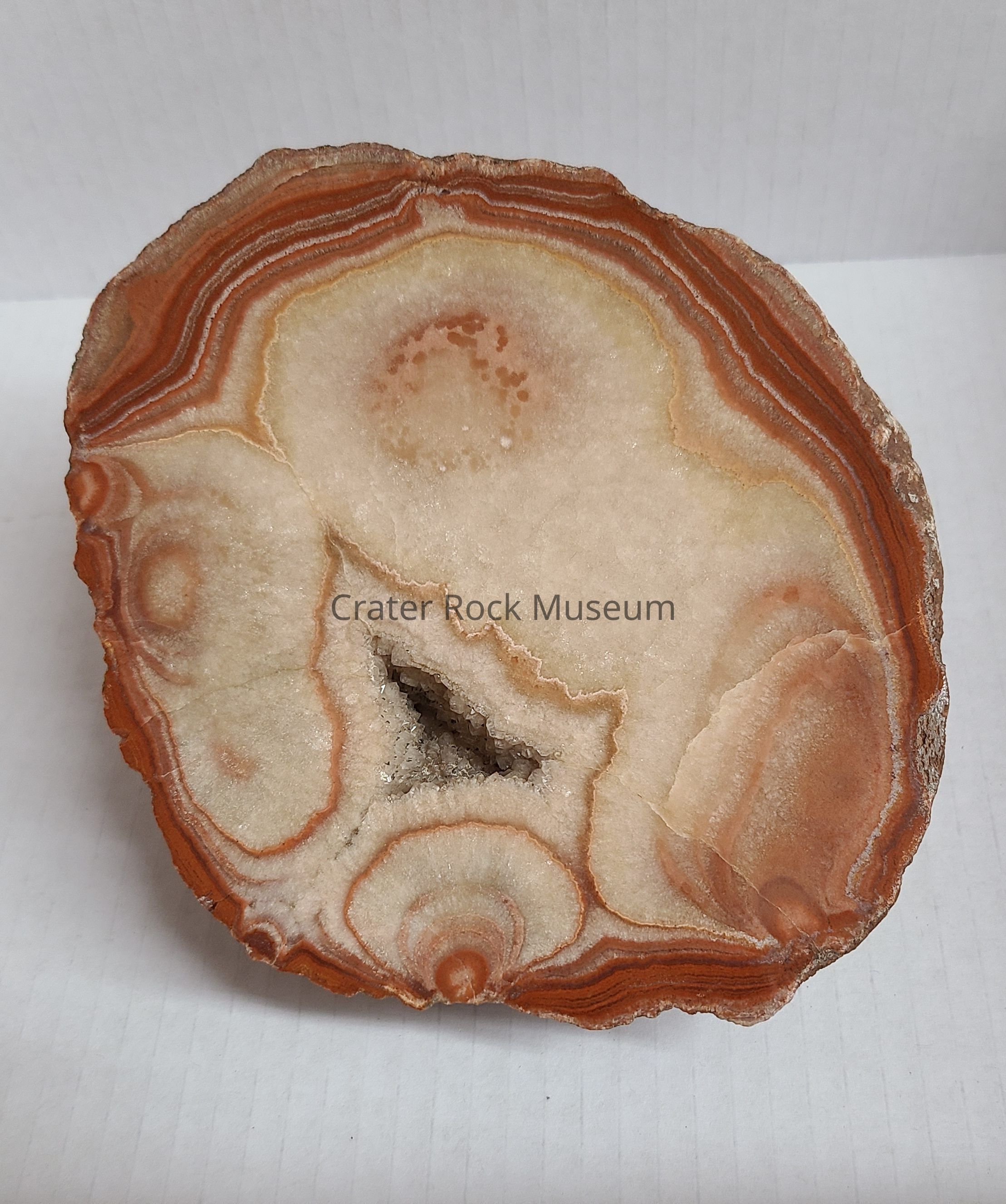 Description: Thick, rounded slab with polished face. Banded tan, burnt red, and dull yellow on outer edges with a crystalline beige translucent center.