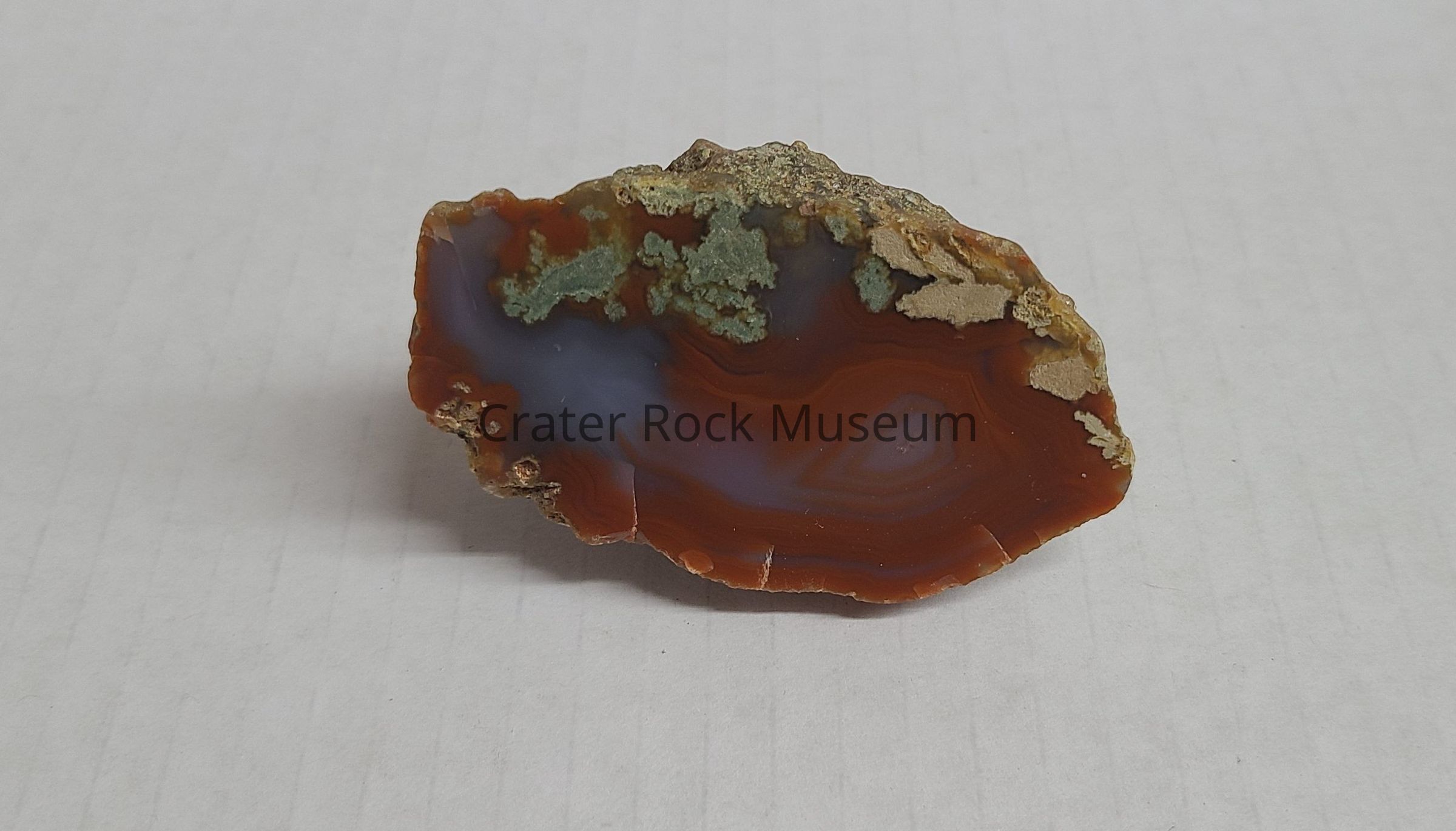 Description: Small rounded specimen with polished face. Banded red and orange with bluish-gray center, with some light green and tan spots on outside edge of one side.