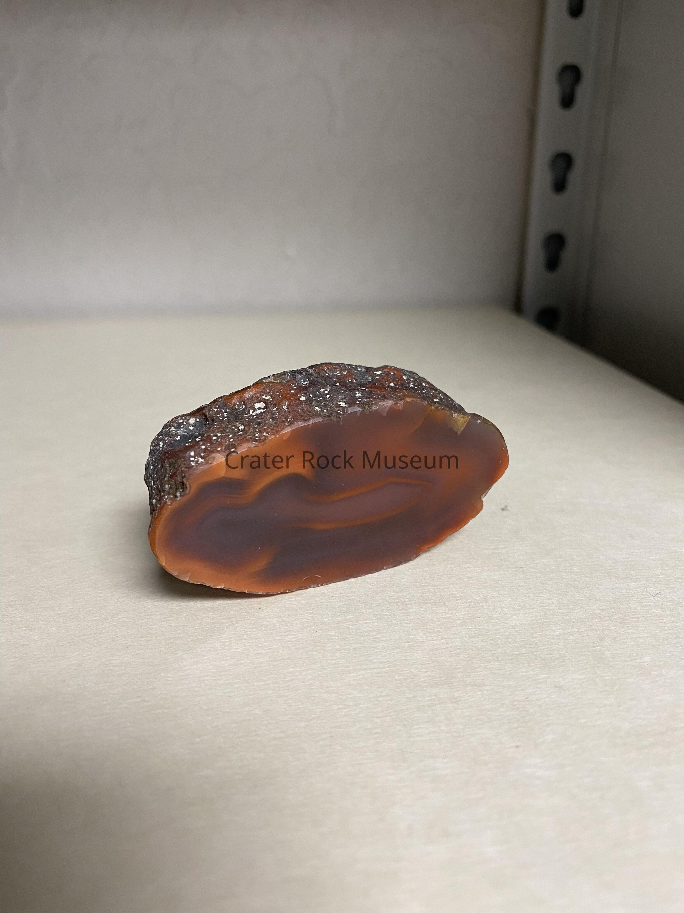 Description: Small rounded specimen with polished face. Dark reds to burnt orange with slight banding.
