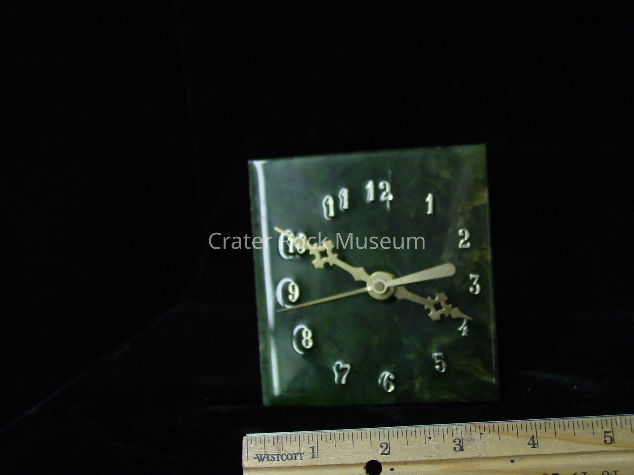 Description : Green Jade clock with gold colored hands and numbers. Free standing and battery