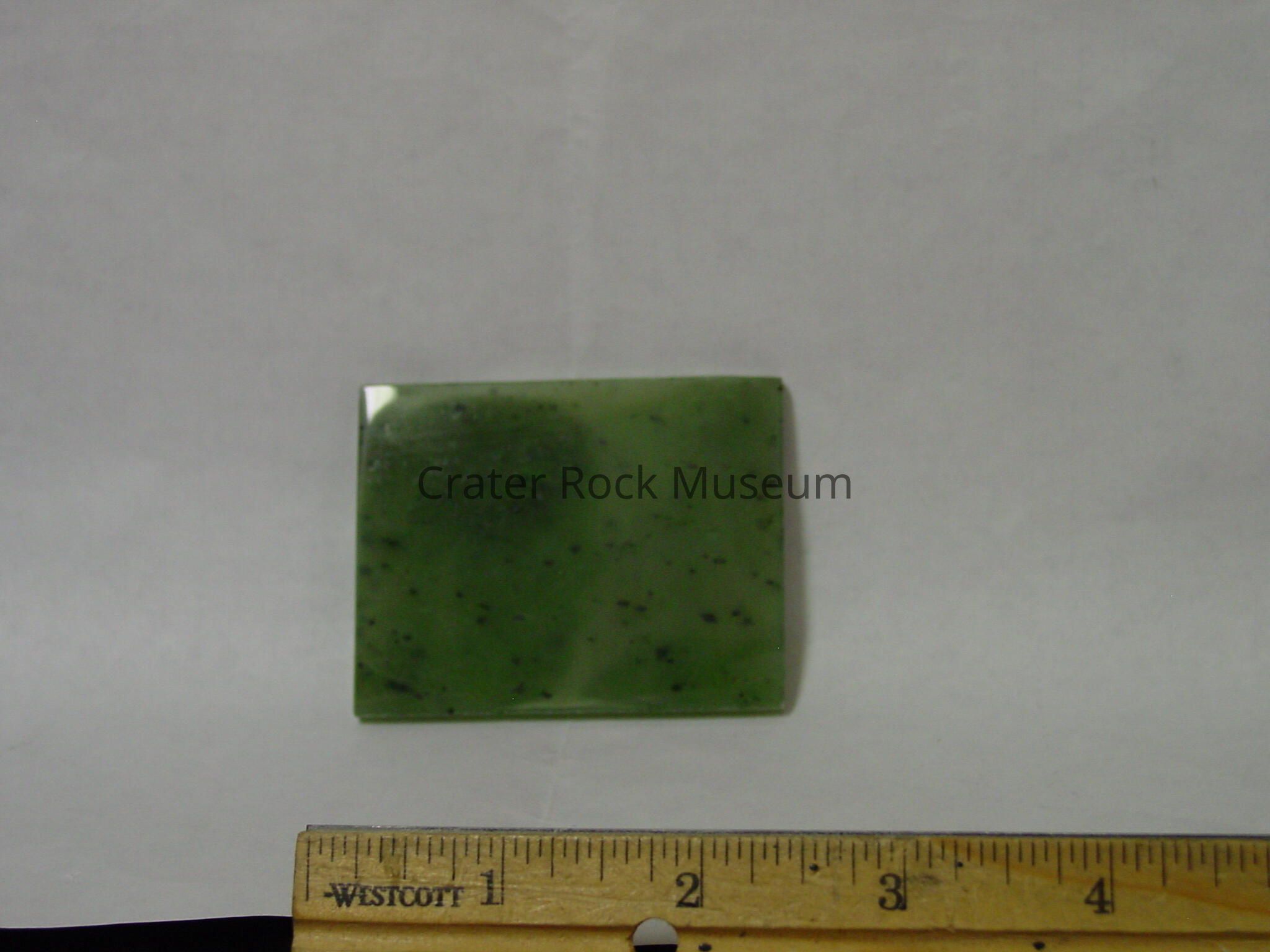 Description : A thin slab of Nephrite Jade that is light green on one polished surface and is speckled with black. It is translucent.