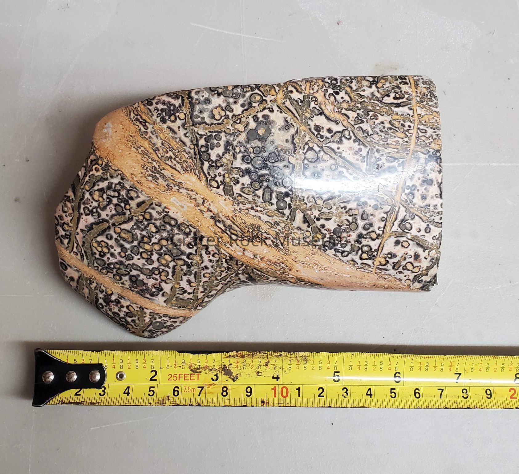 Description: Irregular four-sided shape with one polished side. Orbicular, beige, gray and black spots throughout with some dull yellow and olive green striations running through it.