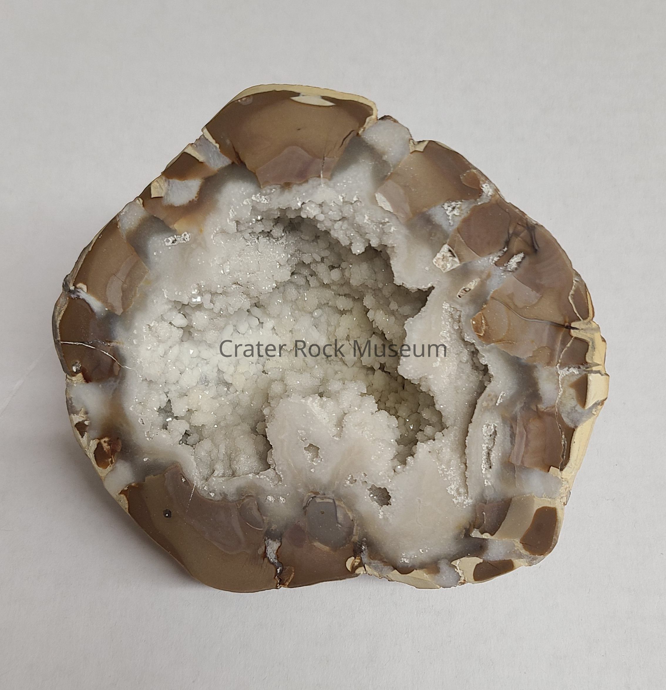 Description: Rounded back with polished face. Creamy tan and brown on outer edges in a cellular structure with a hollow center composed of white, spherical, druzy crystals.Collection