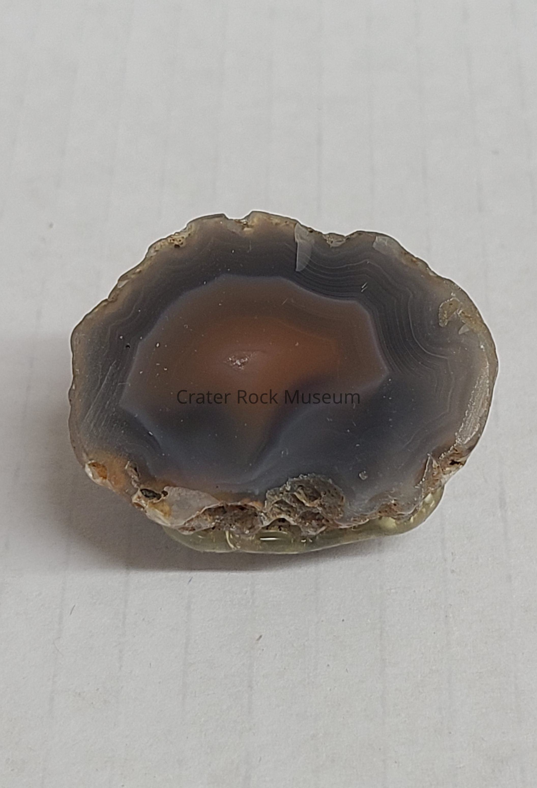 Description: Small rounded back with polished face, translucent gray to dull blue with light banding and a dull pink center.
