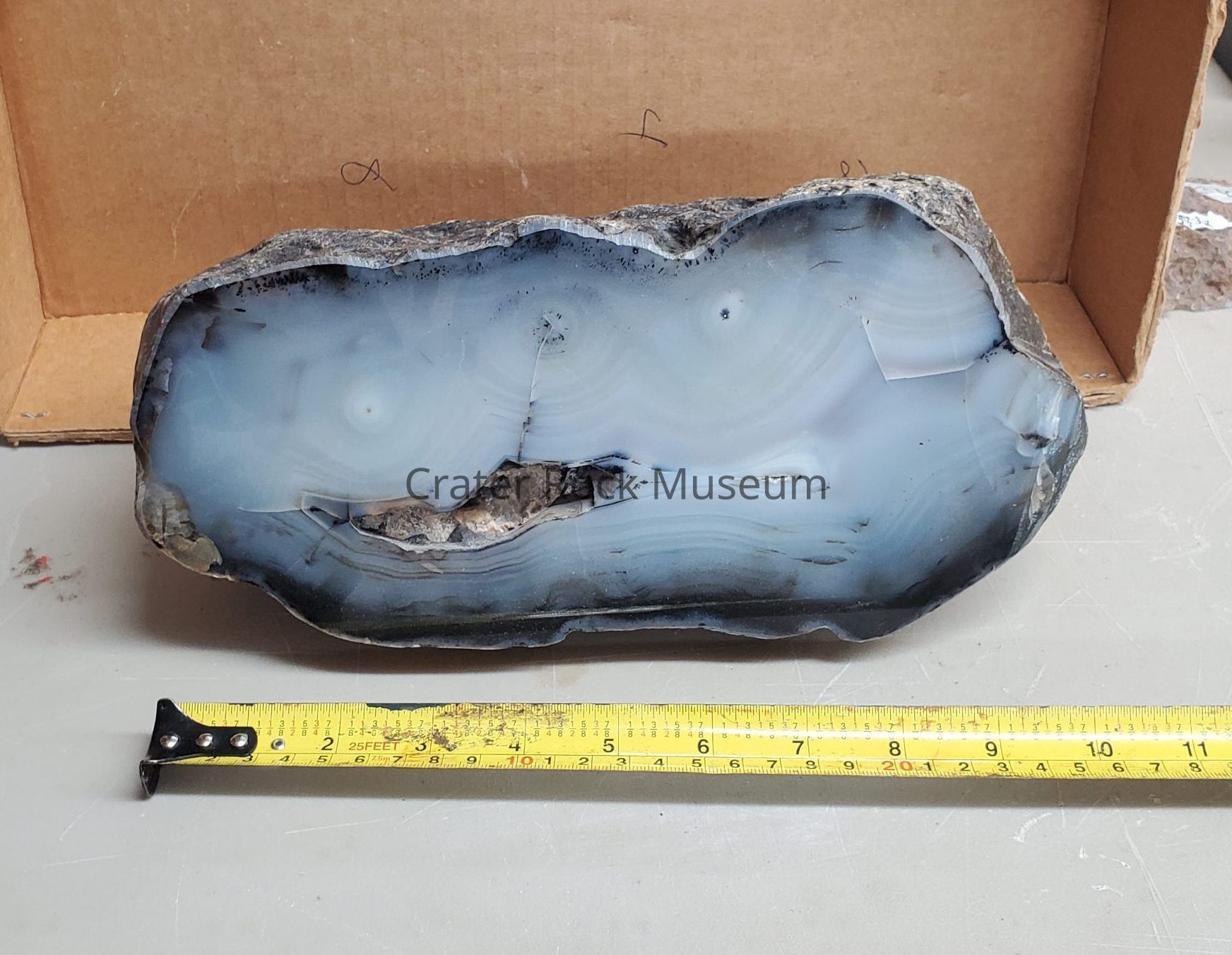 Description: Large specimen with rounded back and polished face, light colored banding, black on outer edges with grays fading to dull yellow to creamy white, with a hollow section in the center.