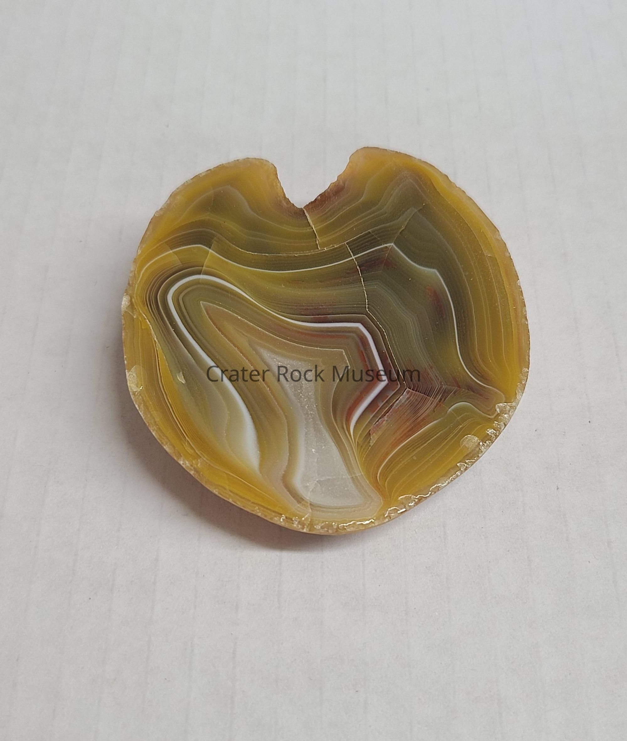 Description: Thin slab with rounded back and polished face. Distinct banding ranging in color from butterscotch, olive drab, gray, white and red in an irregular, non-symetrical shape.