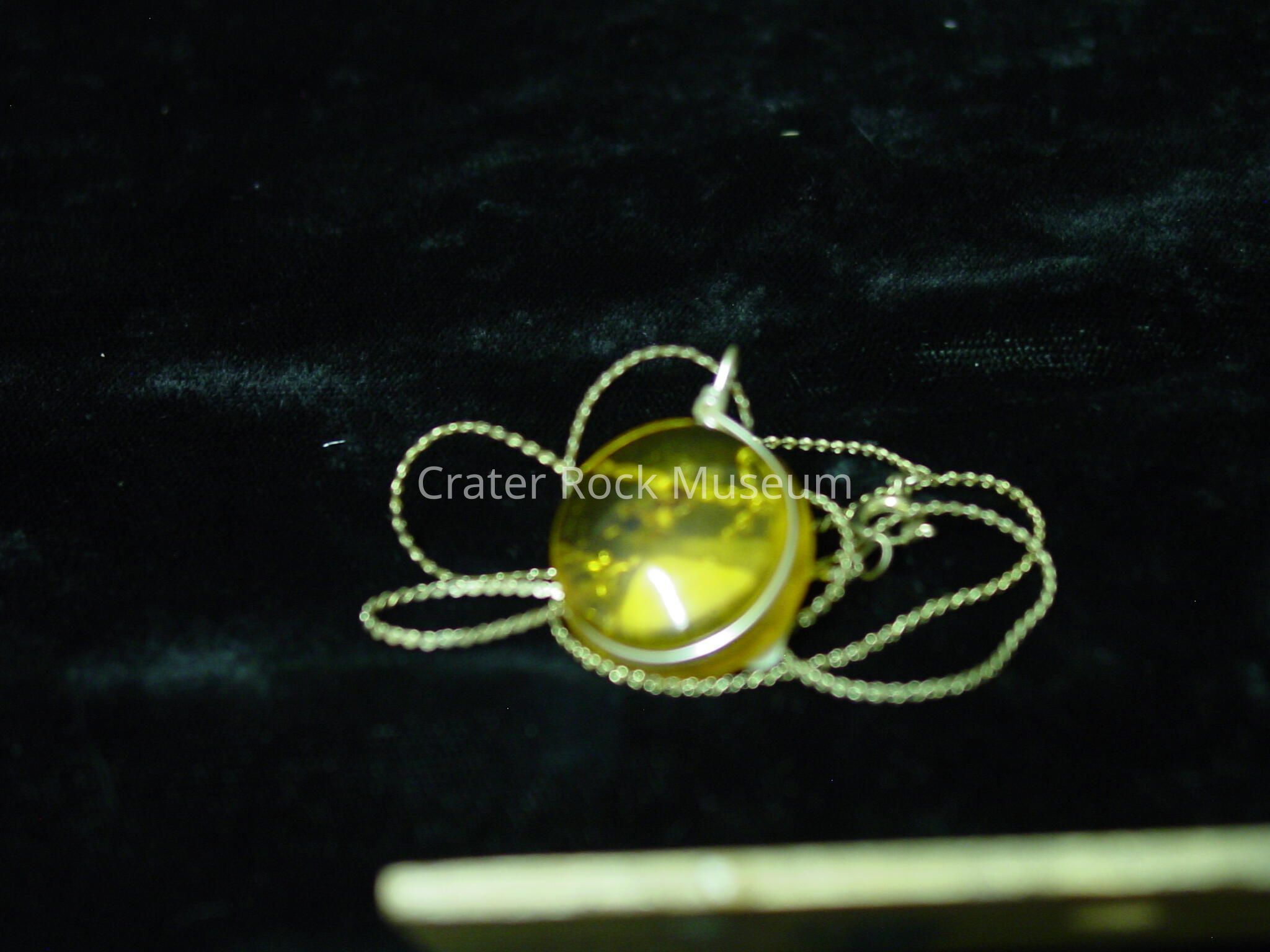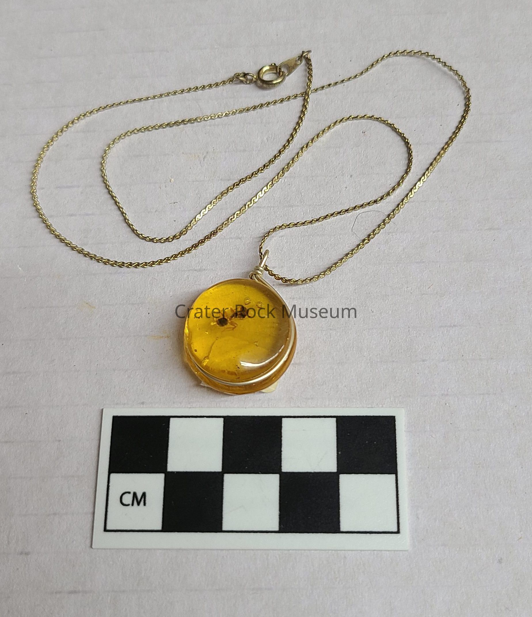 Description : Amber piece with an ant in it. Piece is suspended from a gold chain.