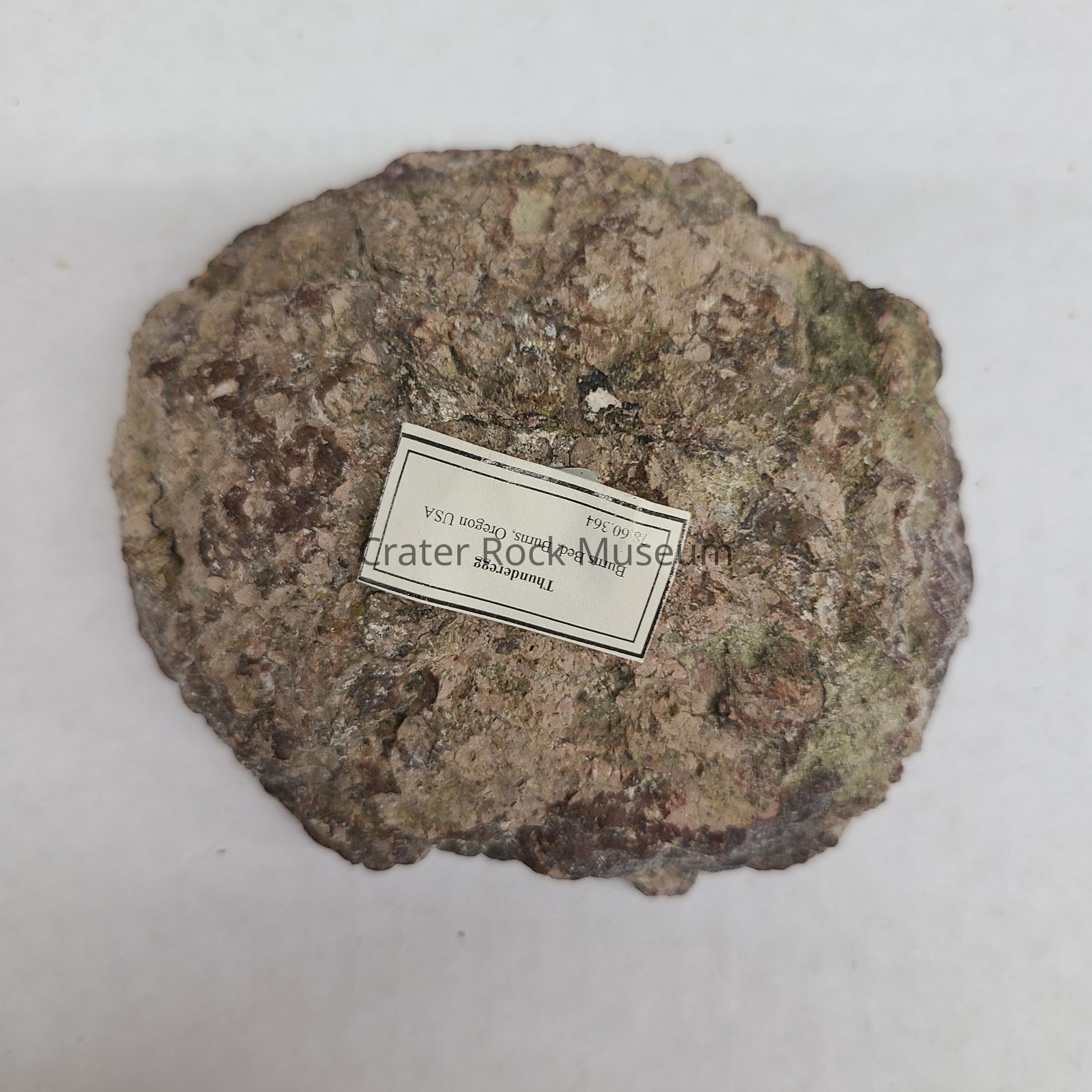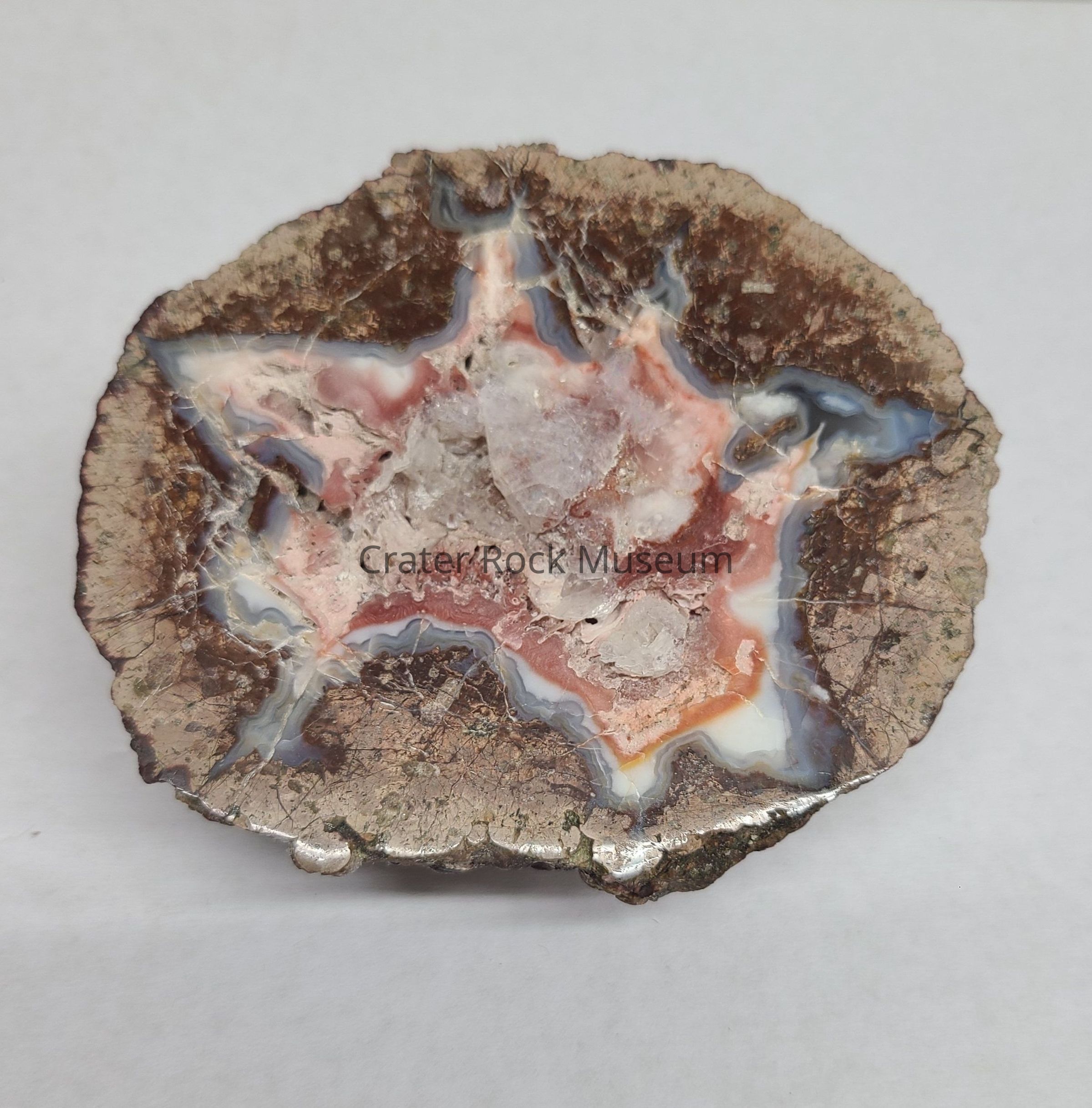A Thunderegg from Burns Beds, OR (Eastern OR). Cut side shows Agate center with open Crystalline middle (Calcite). Surrounded by fortified Agate in Pinks, Red (Cinnabar), White and Blue. Surrounding rock is in Pink, Red and Grey.Dimensions
