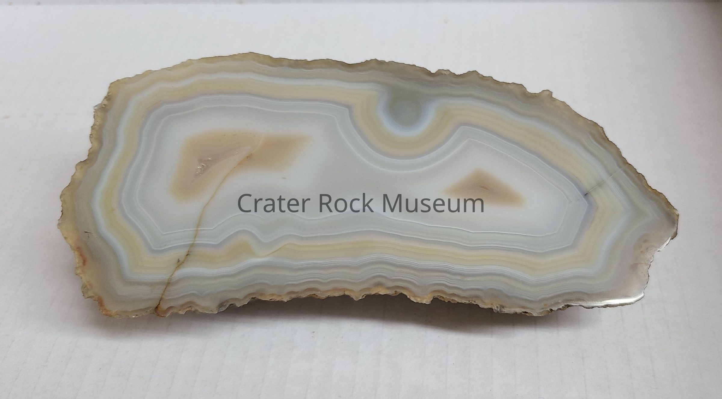 Delmar: "Polished side shows two tan agate centers (one with crystalline spot), surrounded by agate in pale blues, greens, and creamy agate. Two cracks seen."