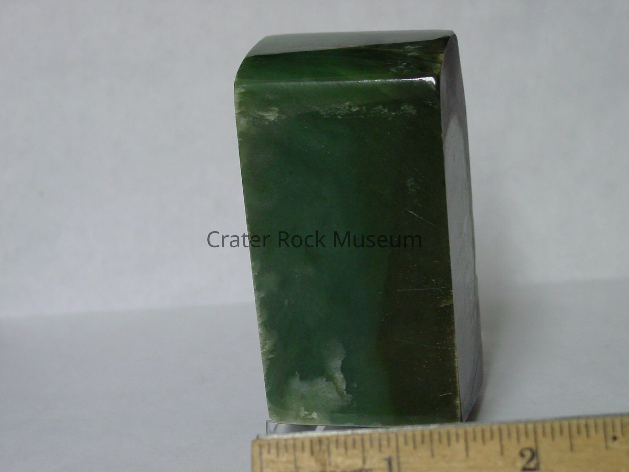 Description : A rectangular block of dark green jade visible that has been cut. Top is rounded off and it and one surface is polished.