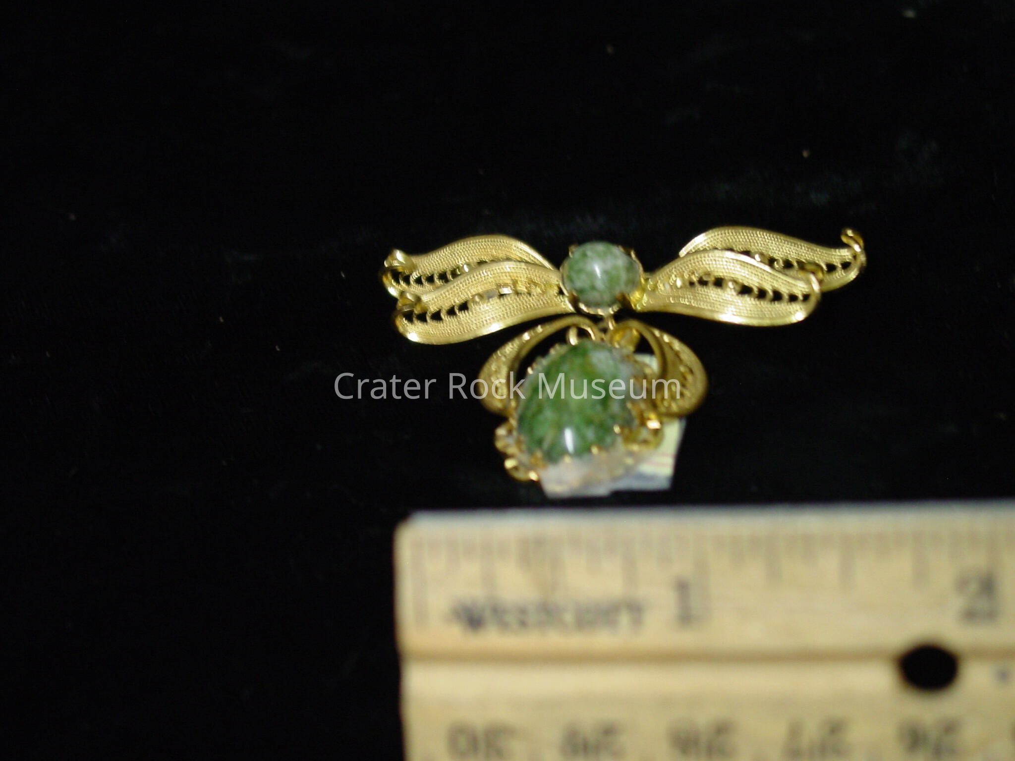 Description : A brooch pin with two parts. One is a small round jade stone,light and dark green in color. The other is an oval stone. Both pieces are connected and mounted with gold and have gold wing shaped surrounds.
