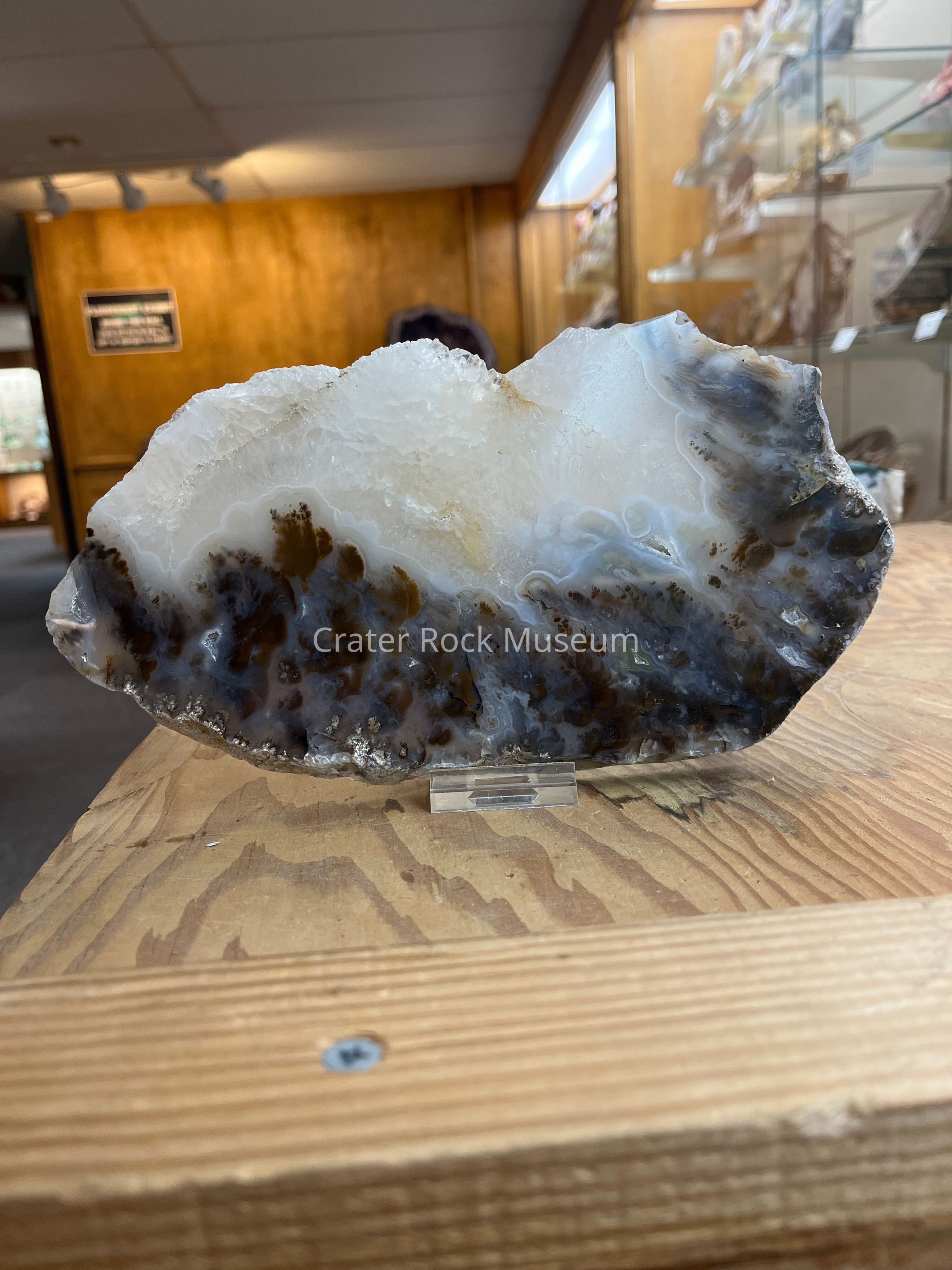 Description: Thin slab with polished face. Transparent gray and brown to blue on one half of specimen and transparent creamy white on the other half.Collection
