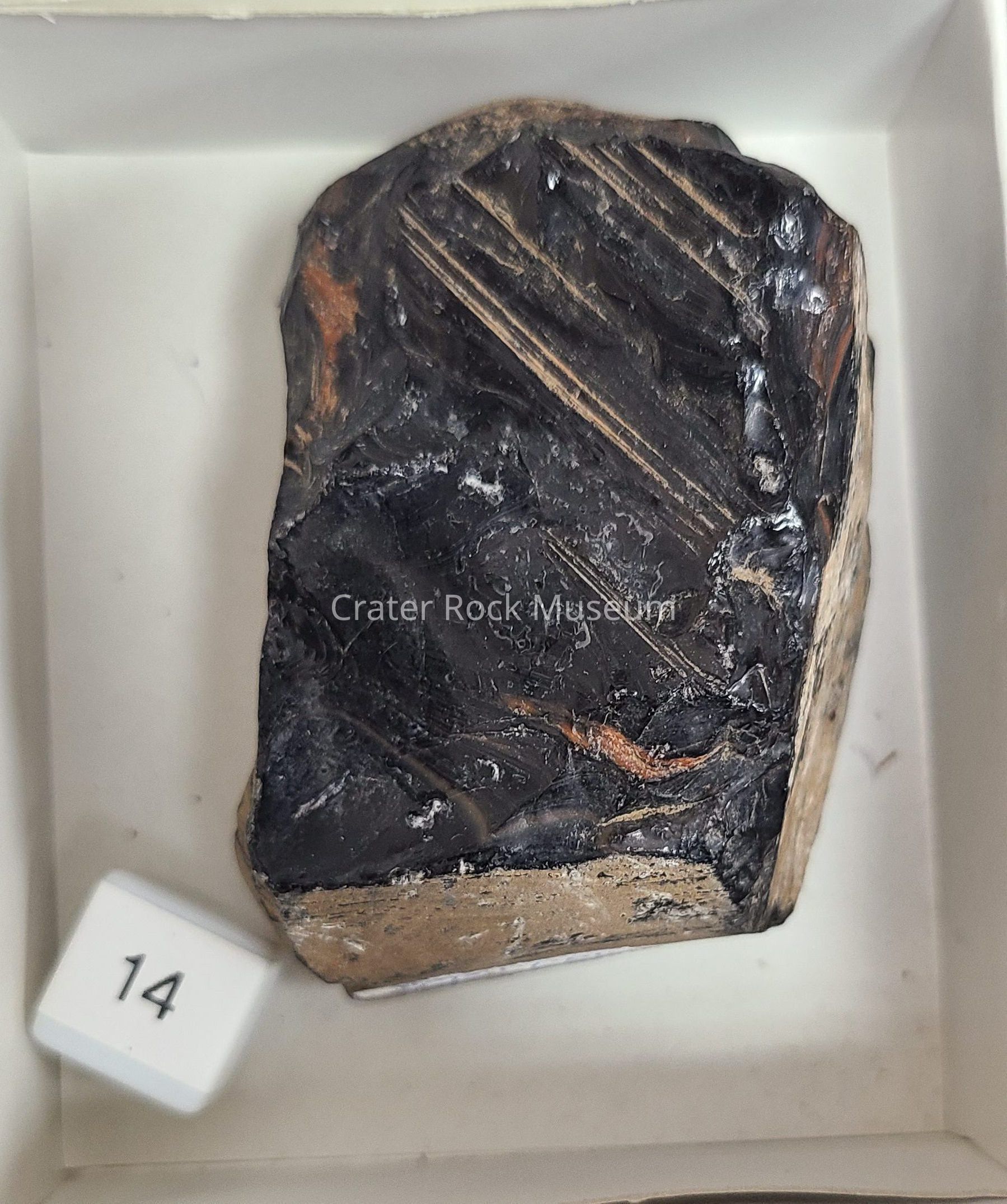 Variety: Obsidian has several varieties. Obsidian can contain small bubbles of air that are aligned along layers created as the molten rock was flowing just before being cooled. These bubbles can produce interesting effects such as a golden sheen, known as Sheen Obsidian or a rainbow sheen called Rainbow Obsidian. Inclusions of small, white, radially clustered crystals of cristobalite in the black glass produce a blotchy or snowflake pattern producing Snowflake Obsidian. Small nuggets of obsidian that have been naturally rounded and smoothed by wind and water are called Apache TearsCollection