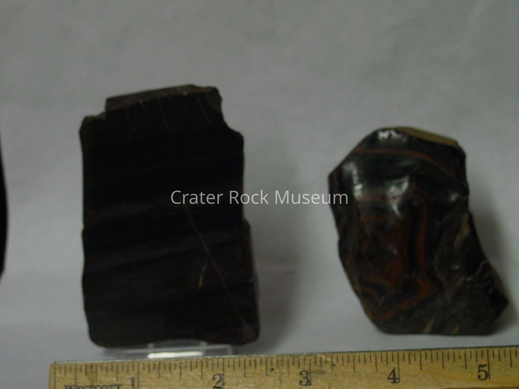 Description: Two chunks of Mahogany Obsidian. One piece has one, cut and polished surface.The other piece is slightly glossy on two sides and rough on the rest.