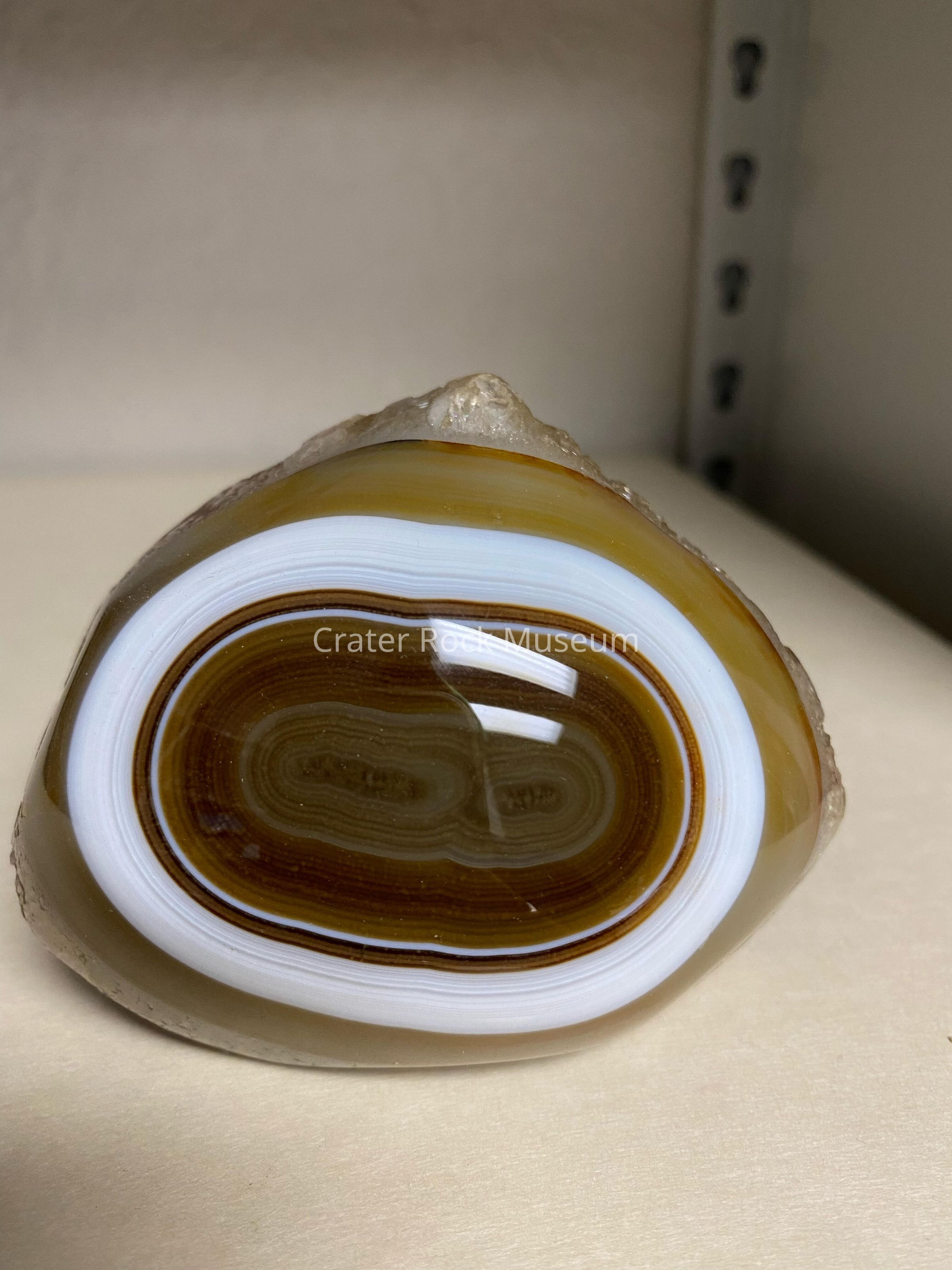 Description: Rounded specimen with rounded polished face. Has a "cows eye" appearance. Banding from a creamy brown on outside edge with an inner white band and a dark brown to dark tan banded center.Collection
