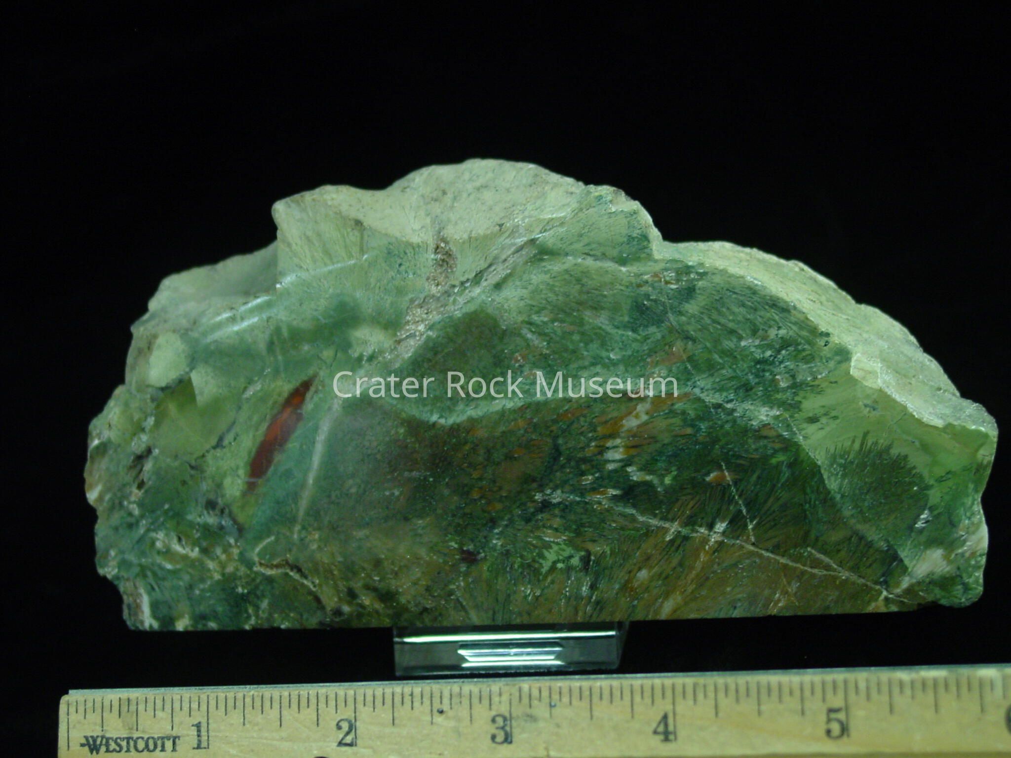 Description: Polished side shows bright green rock and brown, feather- like mineral. A red streak (referred to as a "feather" and a few small red spots are seen).Collection