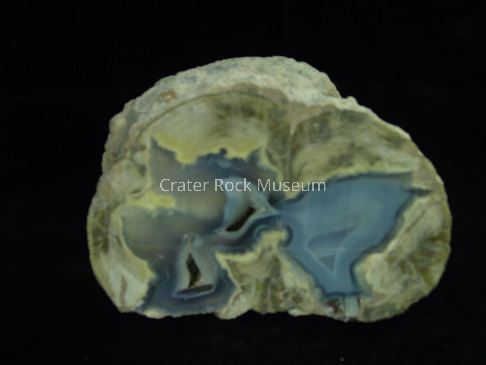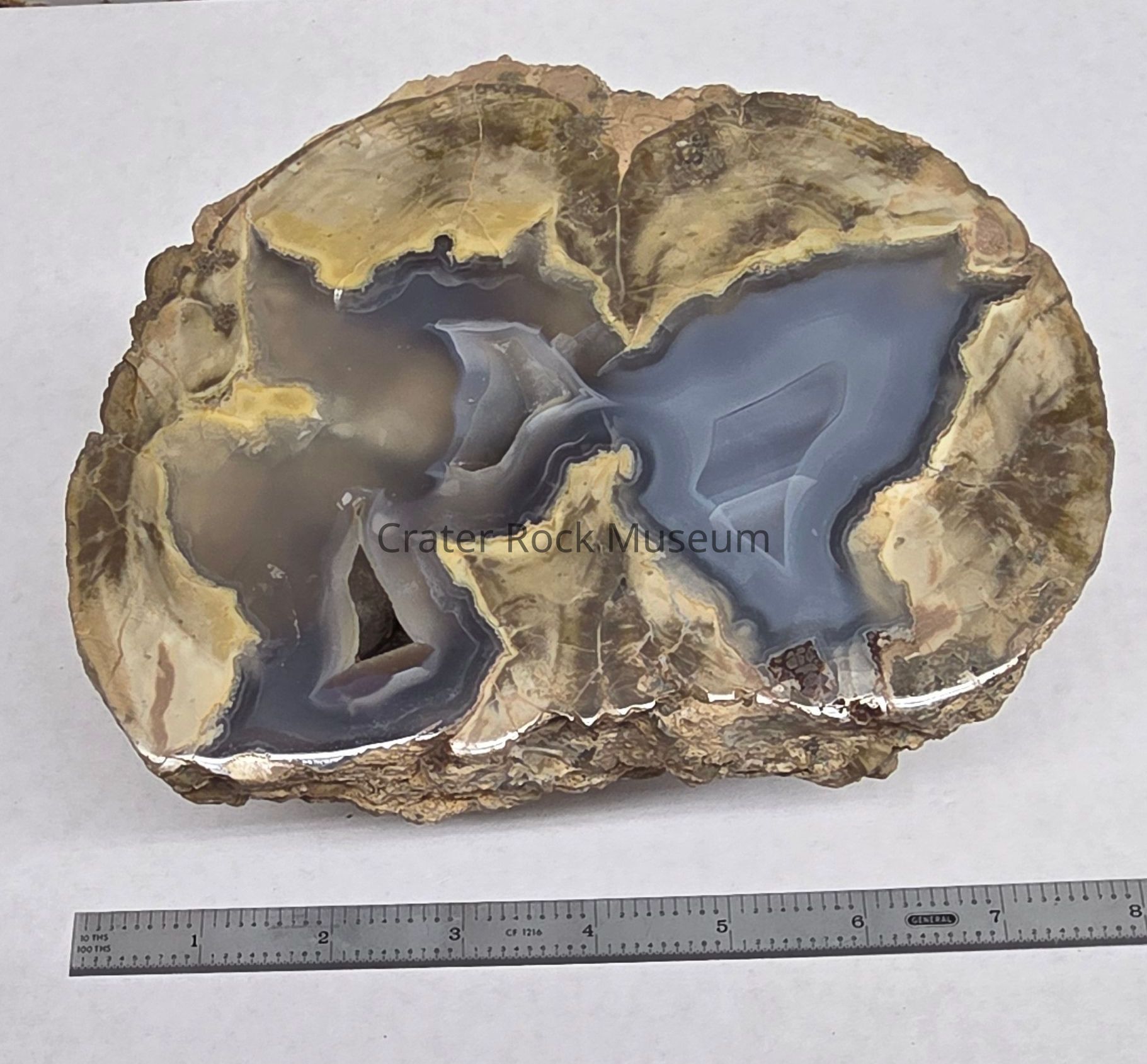 Description: A tan to beige matrix with a translucent to blue-gray agate core. Two small voids are seen.