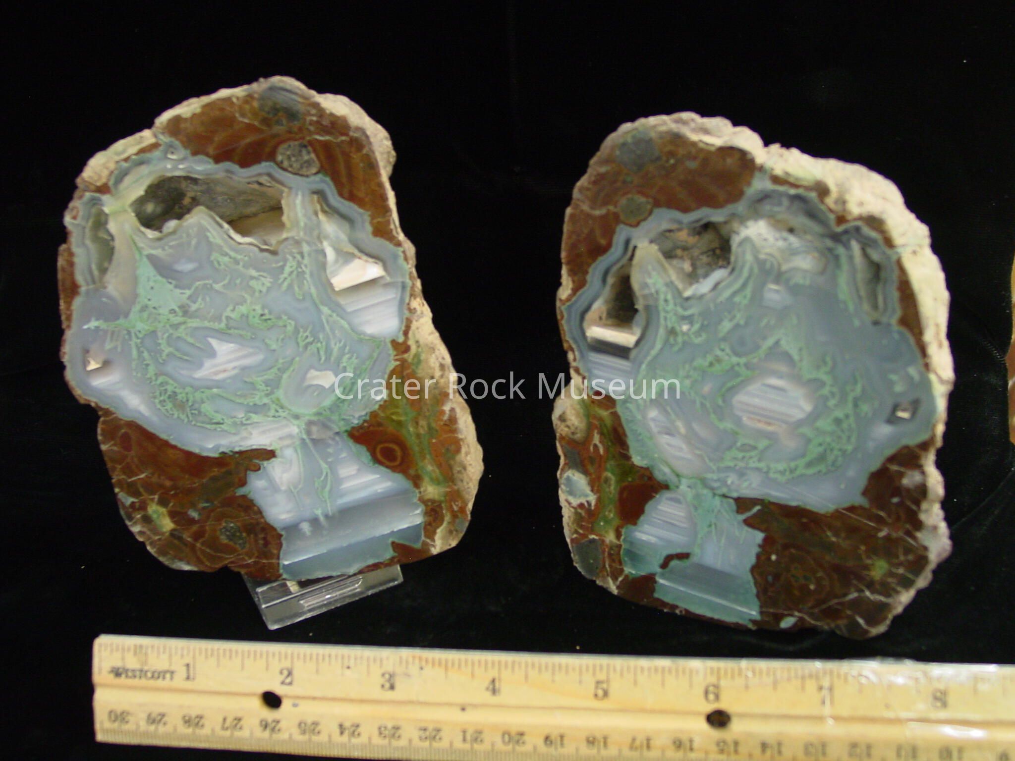 Description: (Delmar) Thunderegg (two halves) with the cut sides showing centers in green moss with blue-gray agate, also some white and blue gray bedding lines. Matrix is red, brown and green.