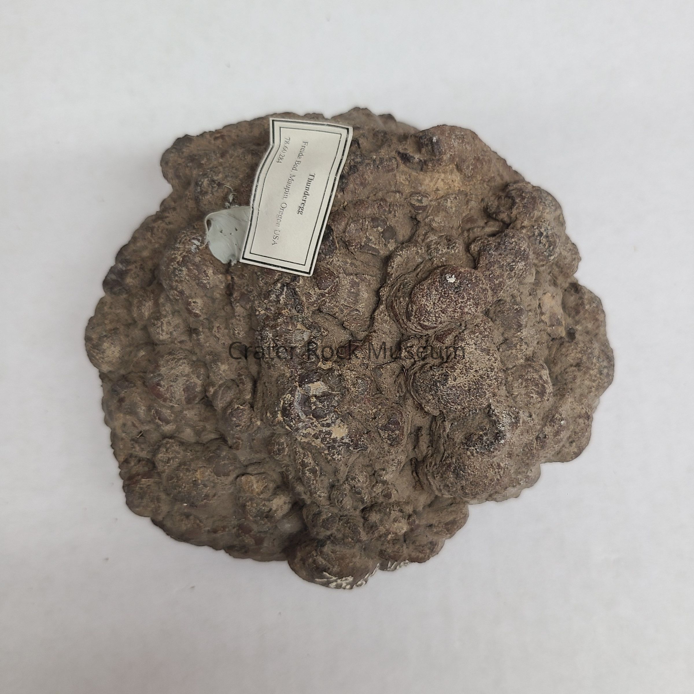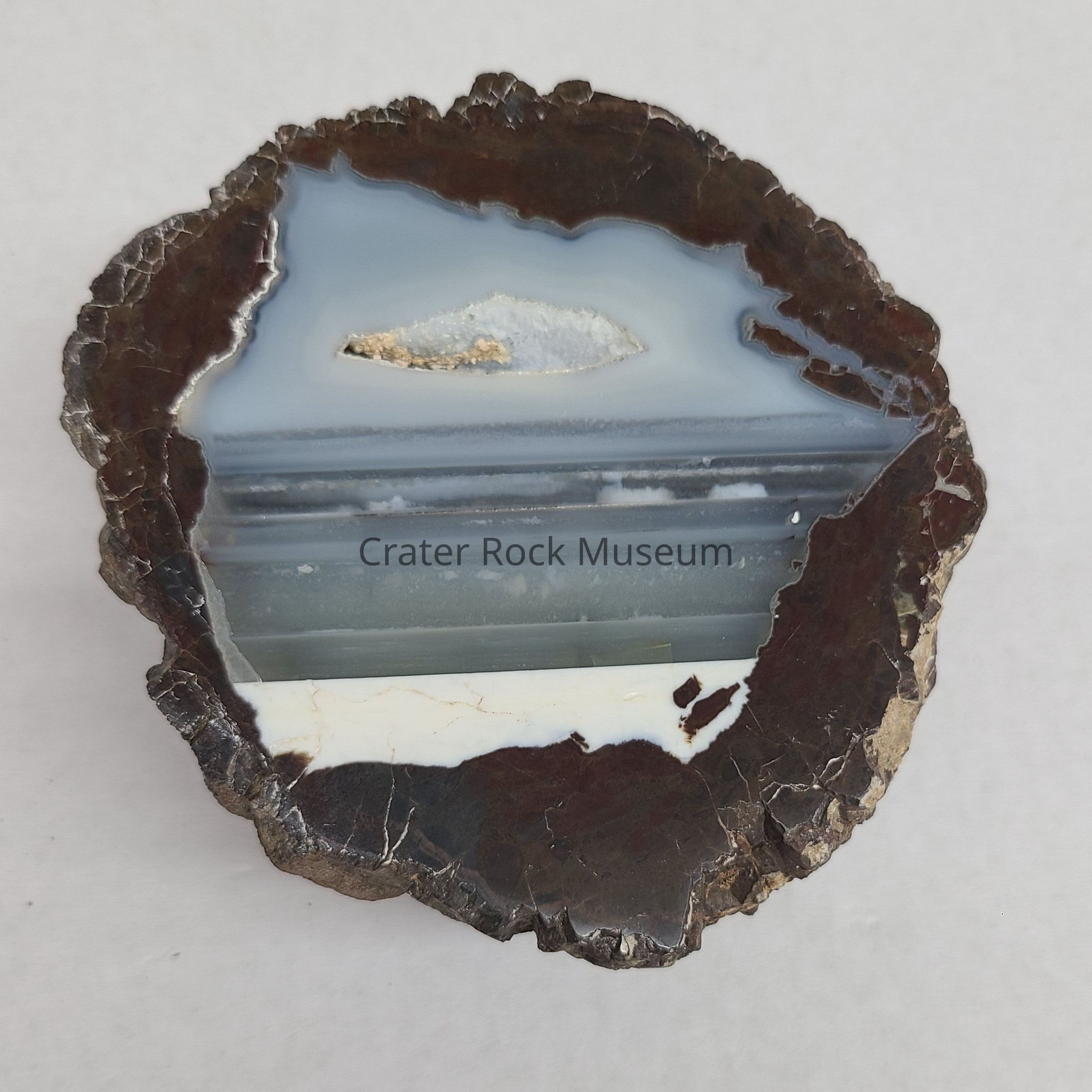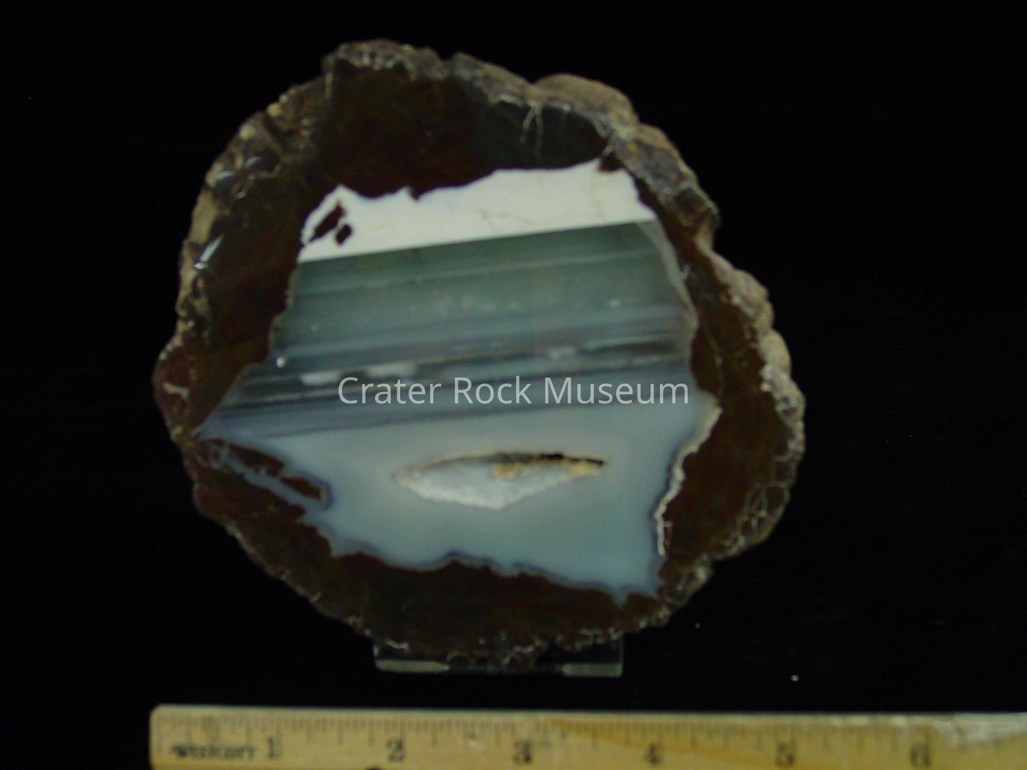 Description: A thunderegg from Easter oregon, an area called "Freida Bed". Cut side shows bedded agate center with open hole in light blues, pale green and white. Matrix is red and gray rock.Collection