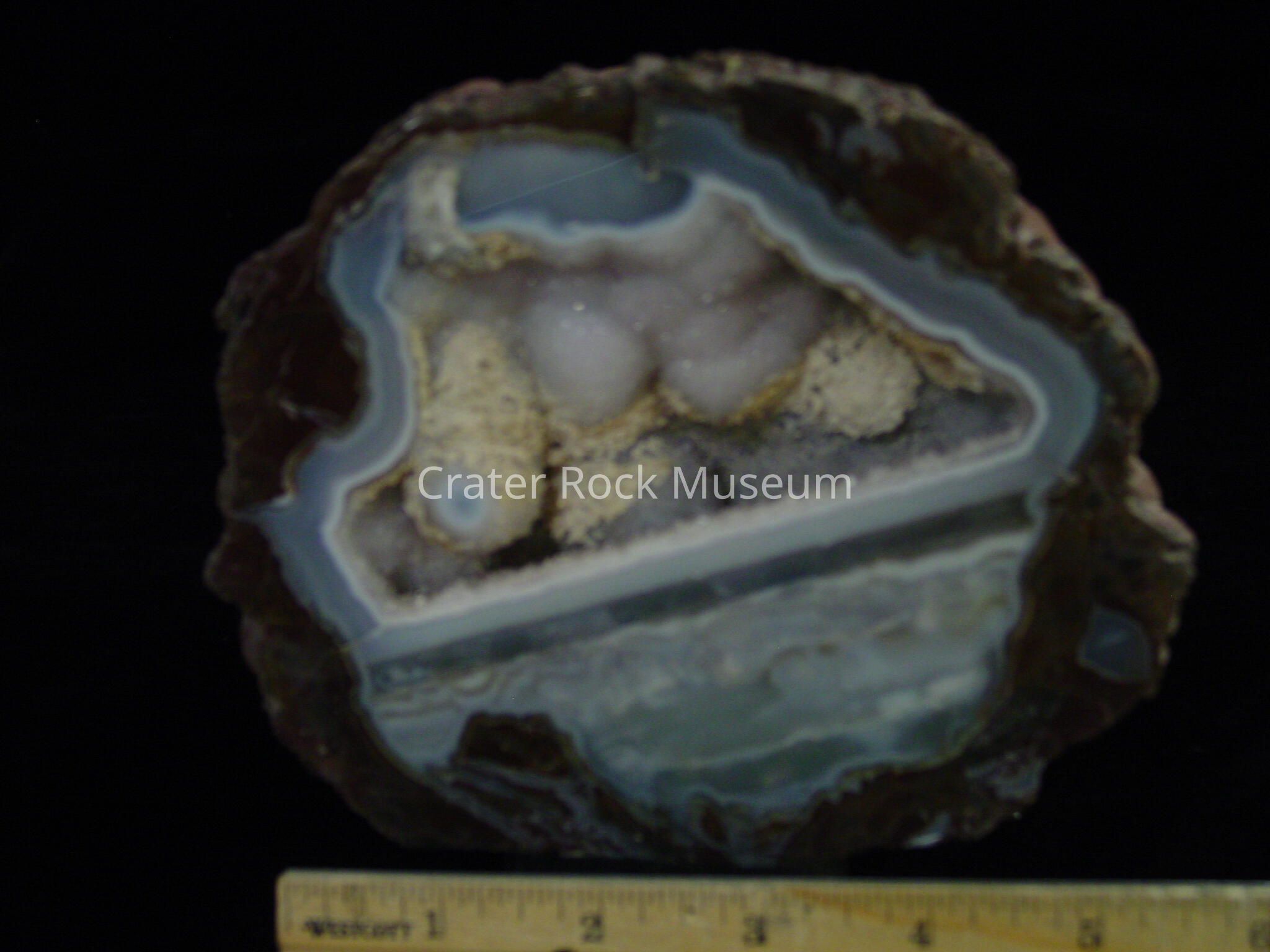 Description: (Delmar) Thunderegg . Cut side shows center is half open and is crystal lined. There is a small bump, partially cut, that shows blue. Outer rock is red and gray containing circular patterns.Collection