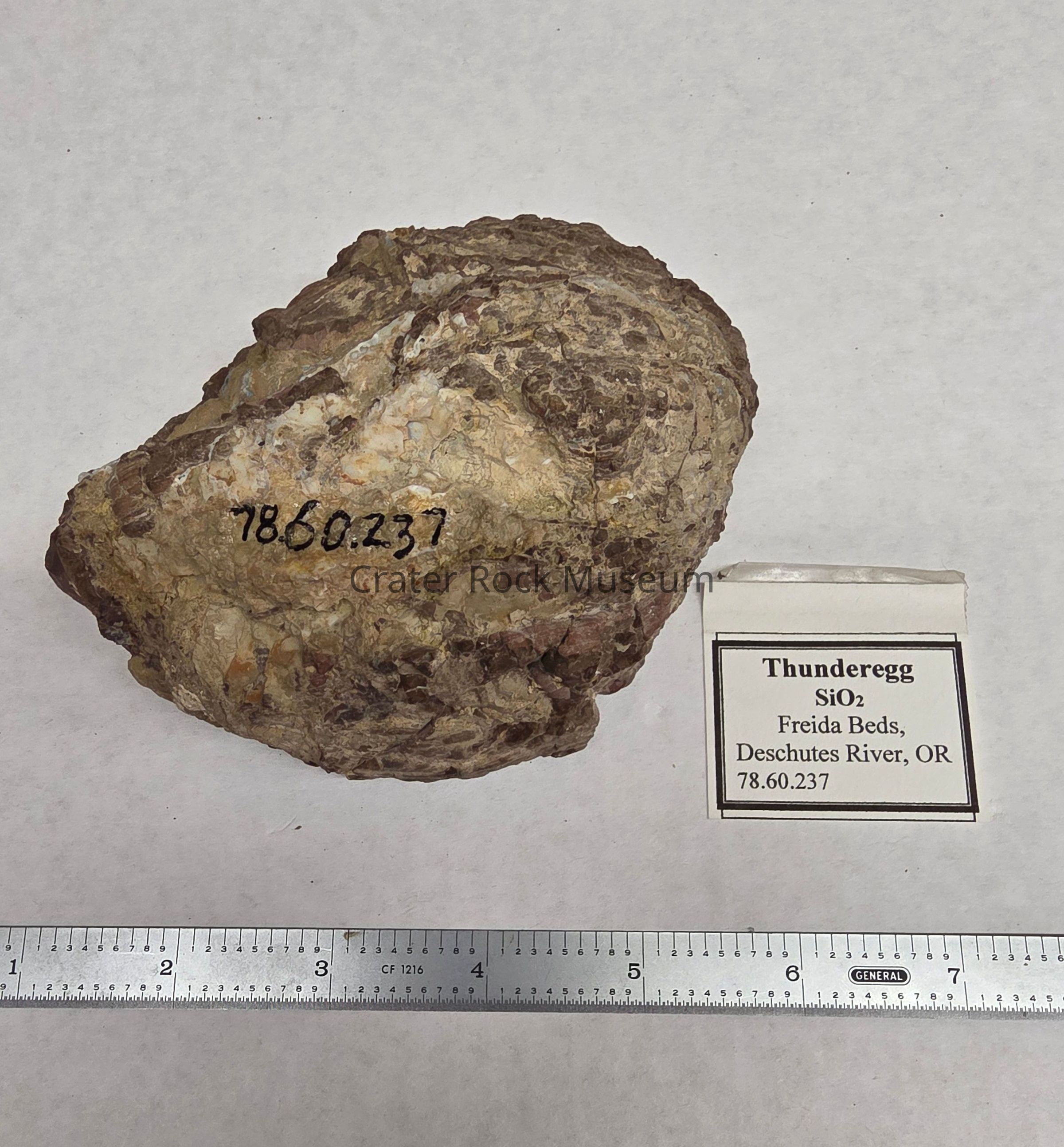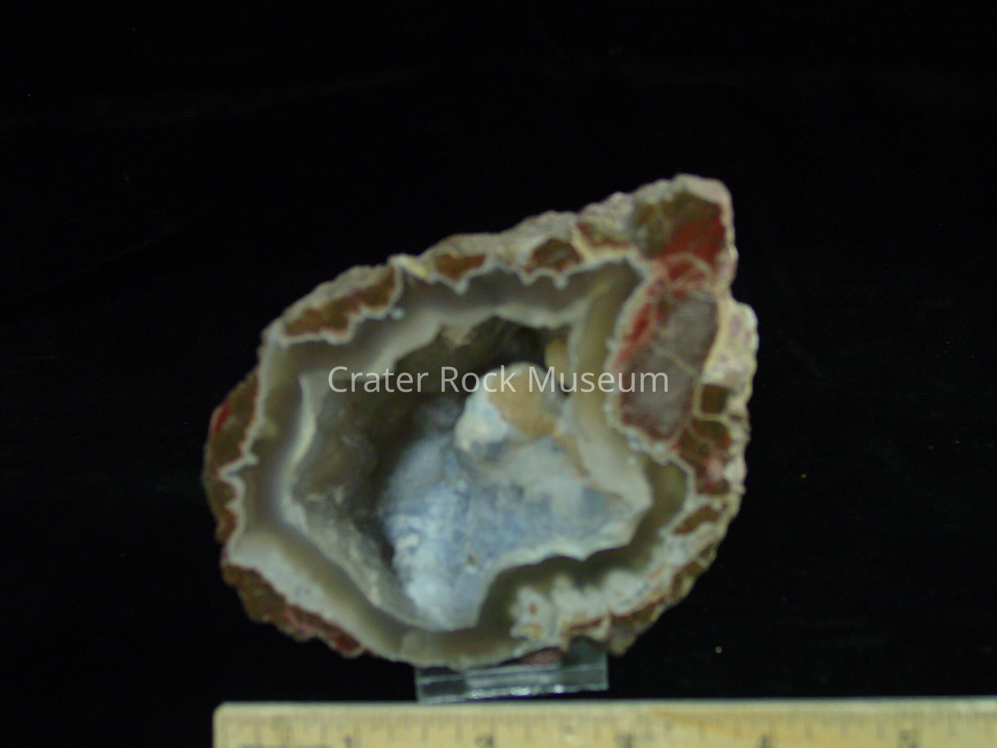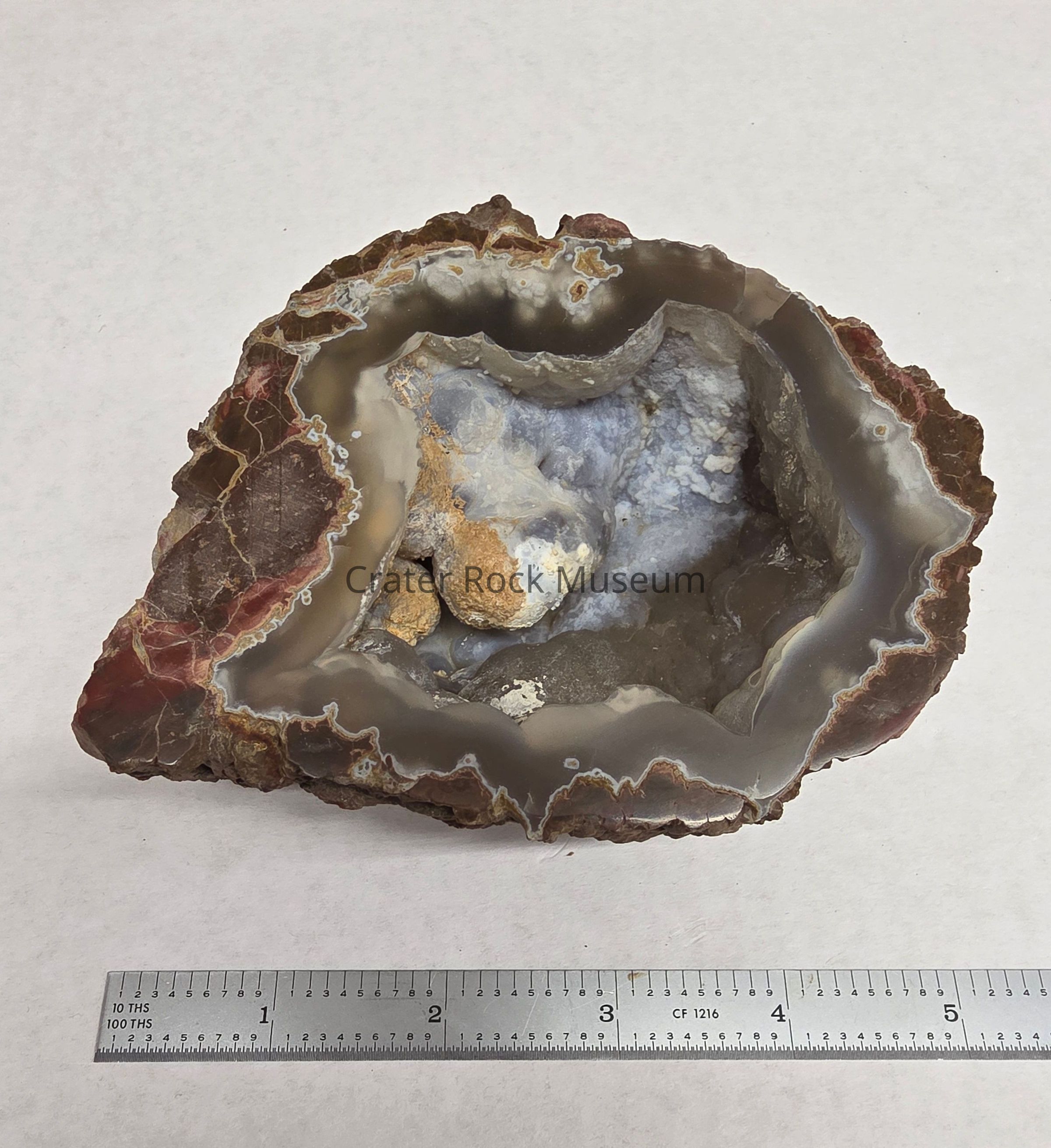 Description: Cut side shows bumpy interior in blue,gray and yellow mineral surrounded by semi-transparent grey agate with grey inclusions. Surrounding rock is red and brown.Collection