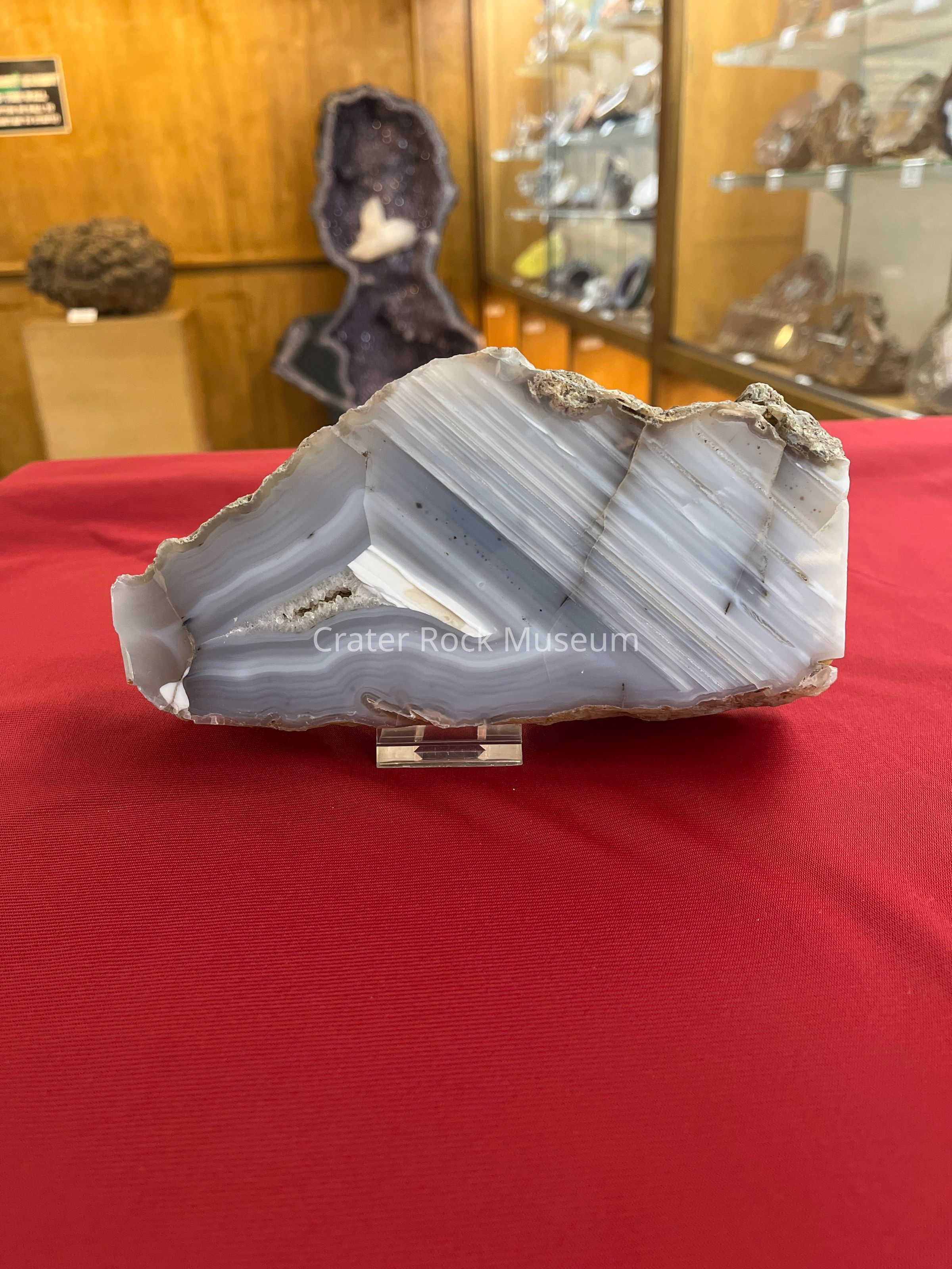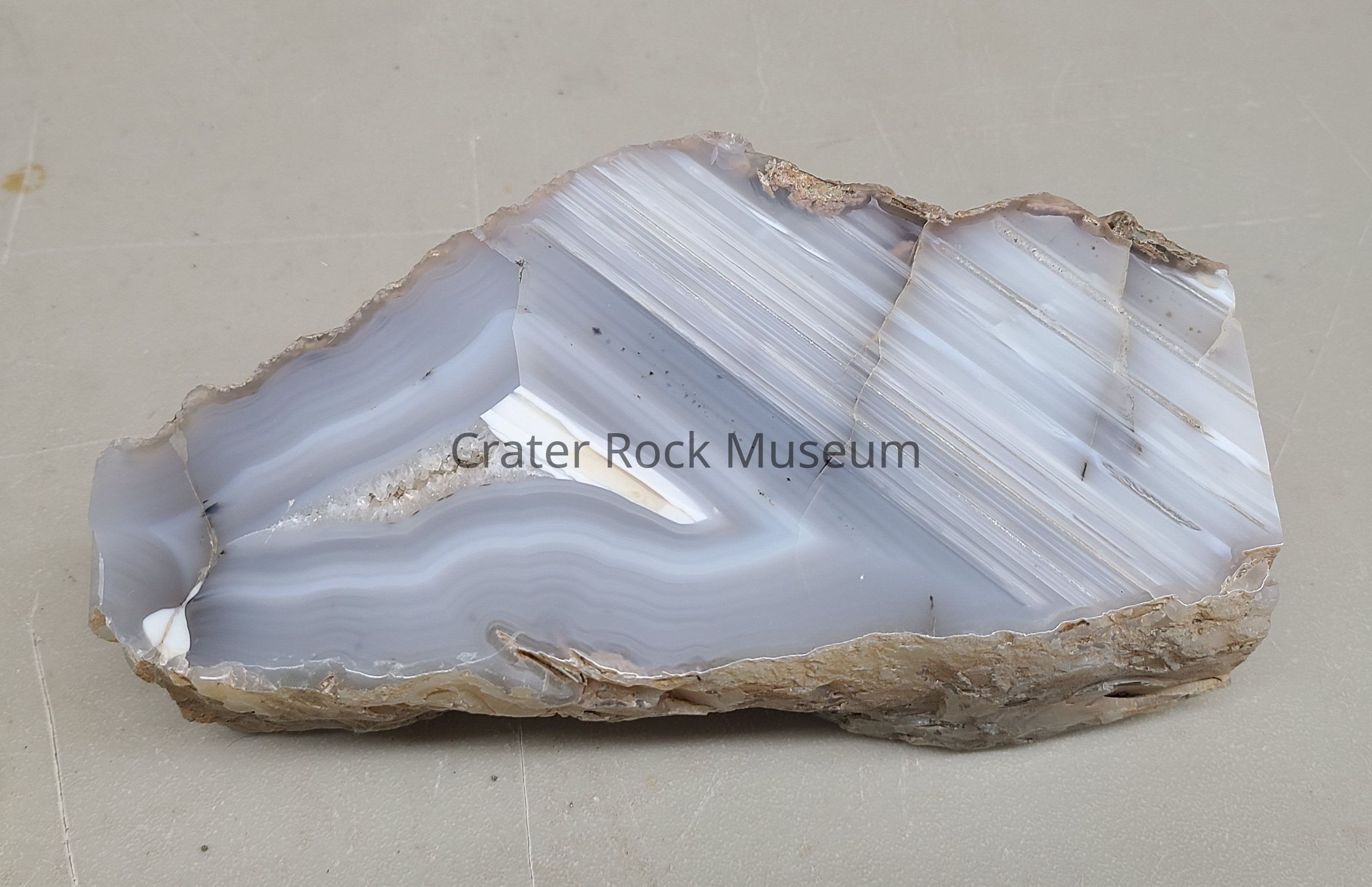 Description: Thick slab with polished face. Half is banded linear, gray, white and yellow and the other half is rounded. Banding of blue-gray and a center section of white and a spot of a hollow crystalline structure.Collection