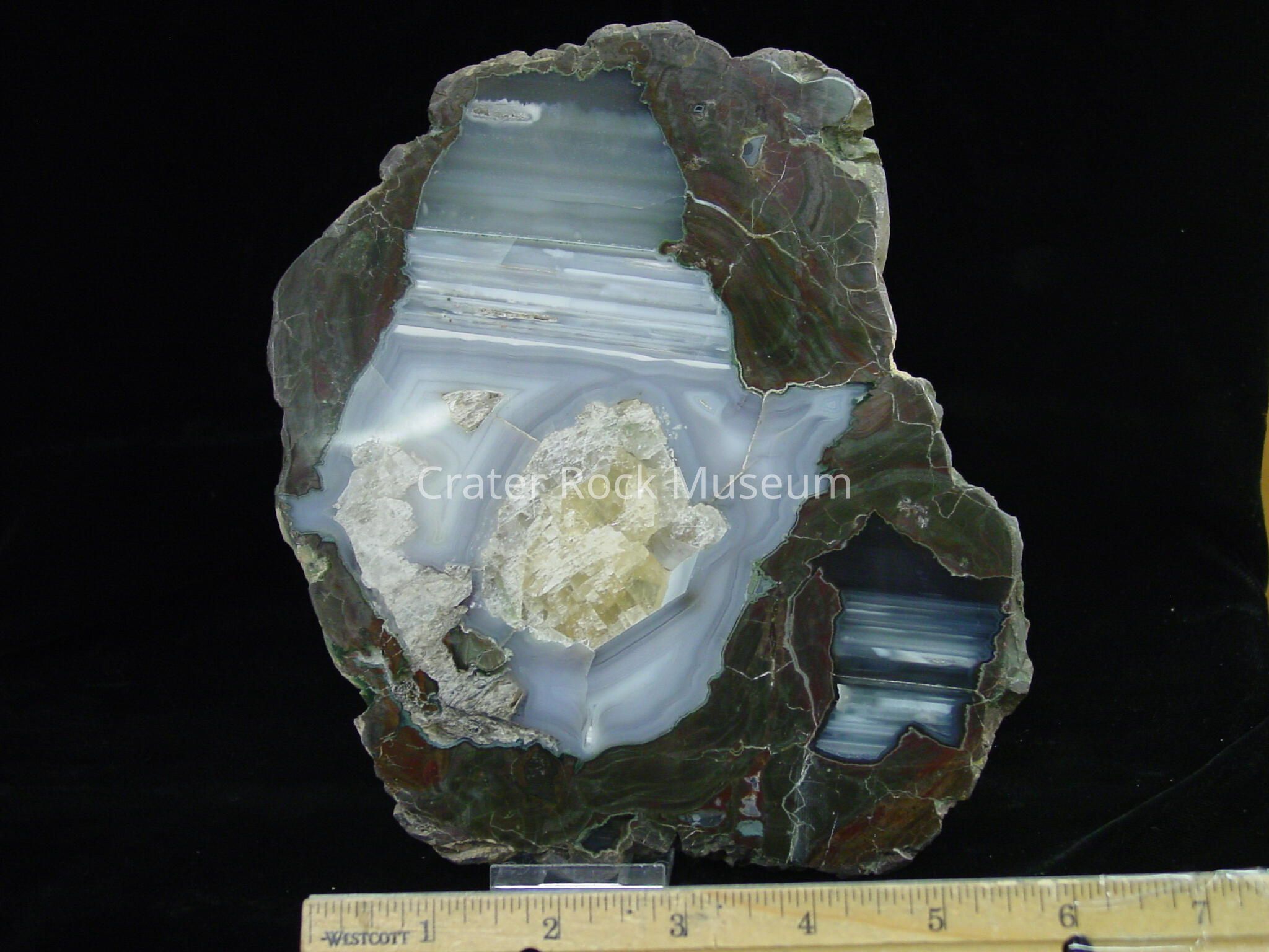 Description: A slice of thunderegg from Eastern oregon, an area called "Freida Bed". A translucent agate interior with some horiz. bands of white to purple-grey and a central calcite inclusion that has a honey color. Surrounding rock is a purple and grey with some green tint in places.Collection