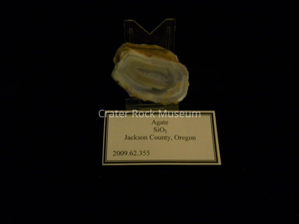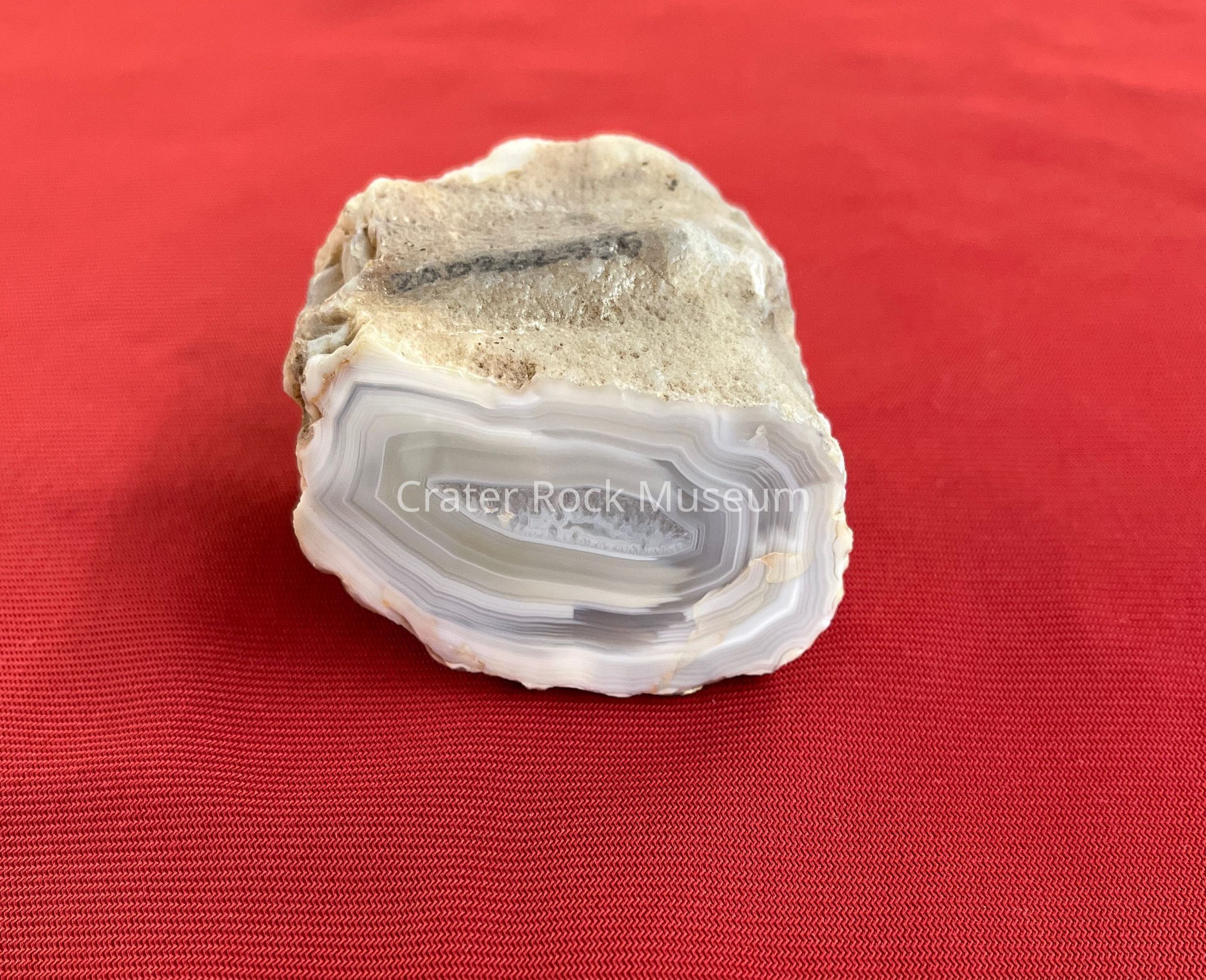 Description: Rectangular shaped specimen with one end sliced and polished. Banding is somewhat symetrical with creamy white and grays and a translucent white crystalline center.Collection
