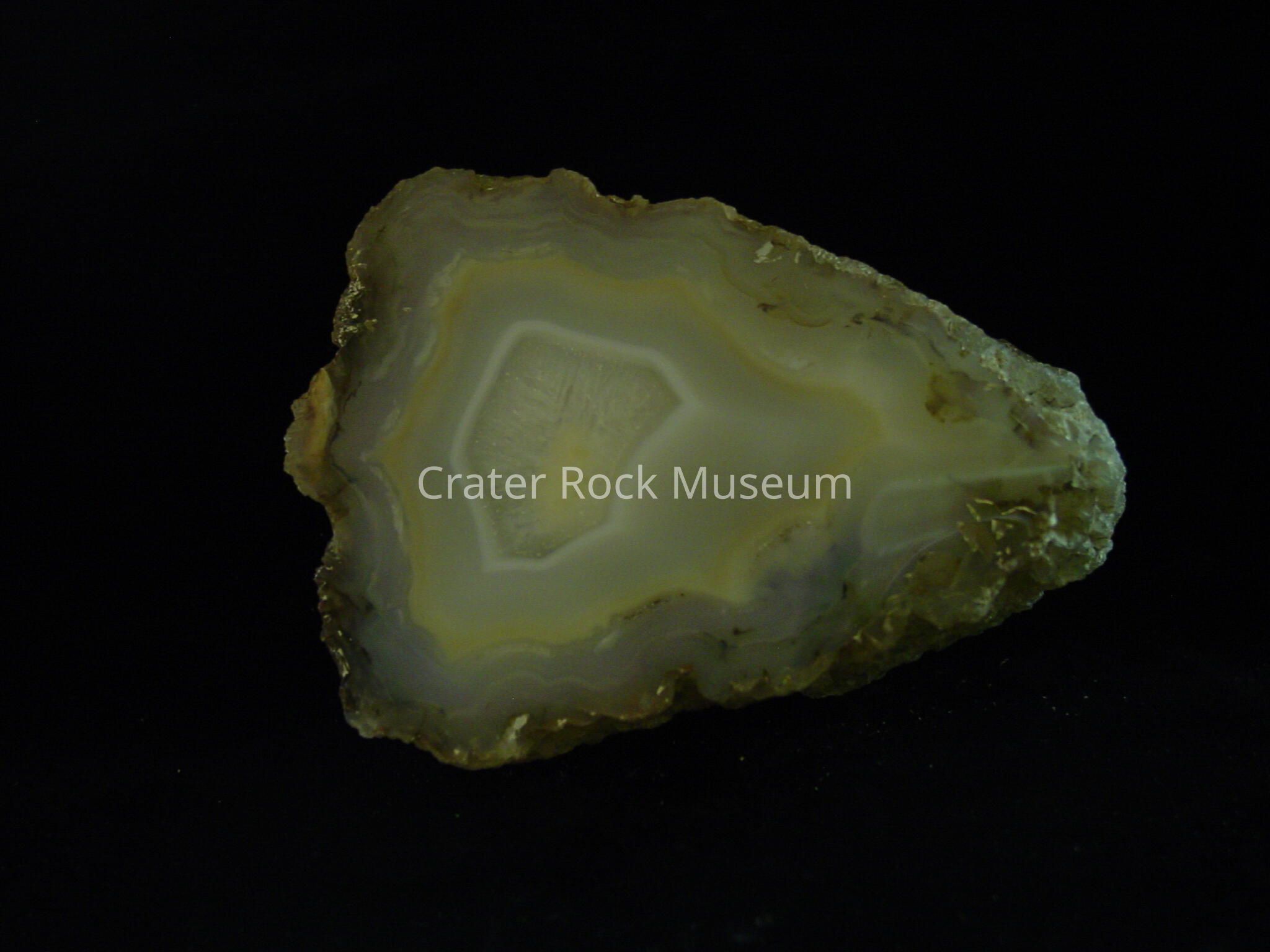 Description: Rough, rounded back with polished face. Creamy white and yellow, translucent banding with dull yellow and white crystalline center.Collection