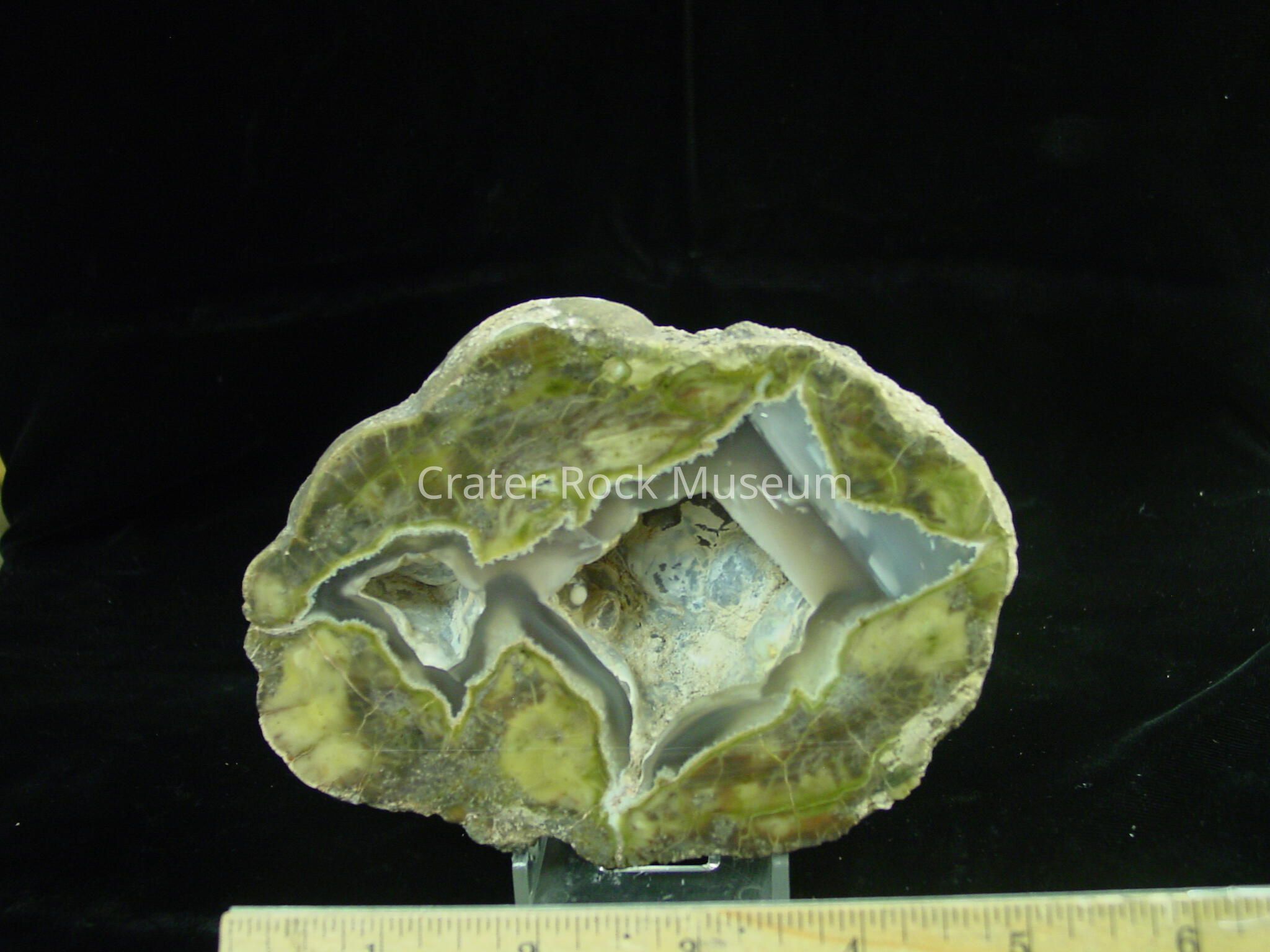 Description: A pale green and tan agate matrix with 2 voids. Interiors are a greyish blue and tan to white botroidyl texture surrounded by a thin band of clear agate.Collection
