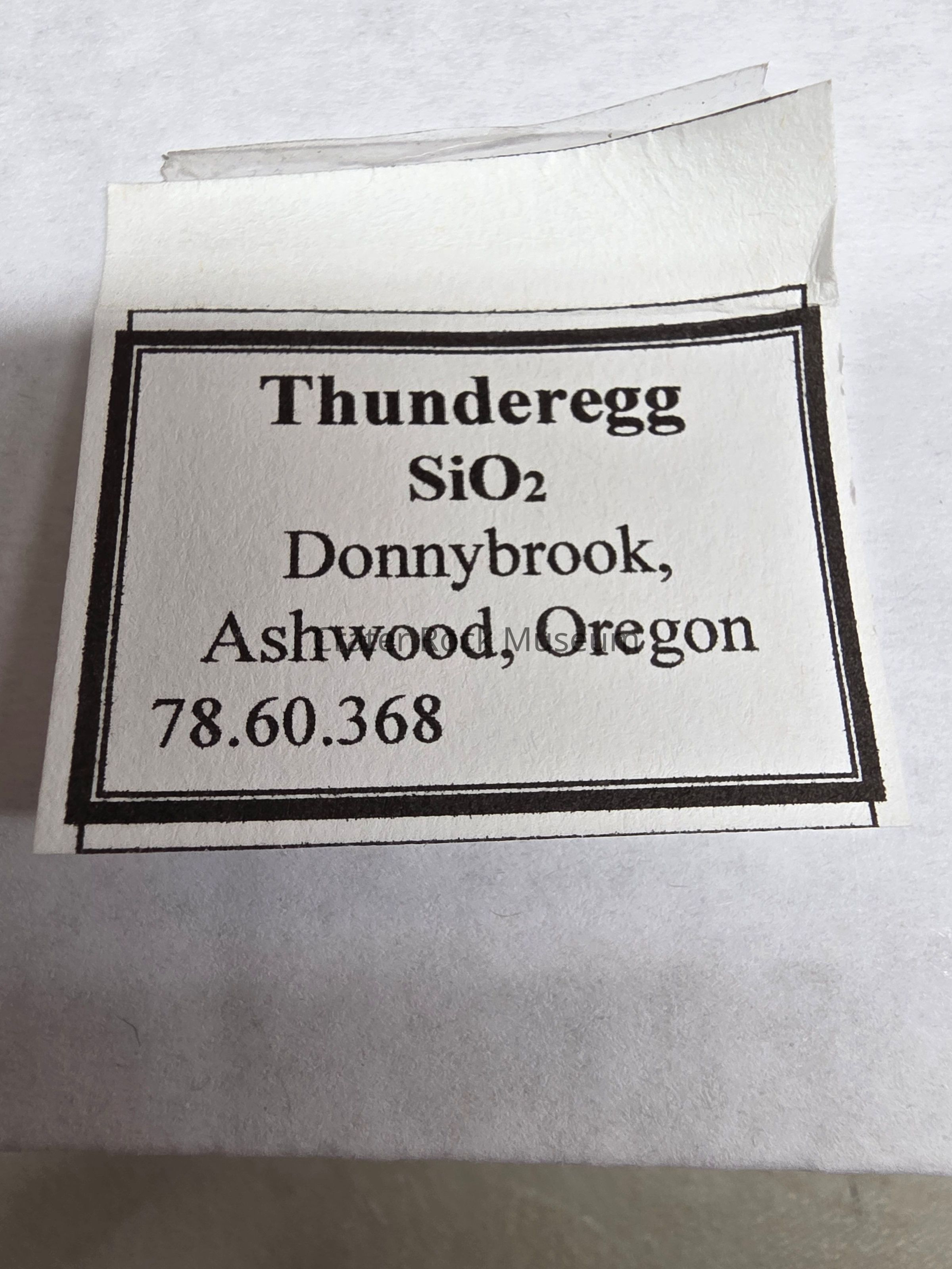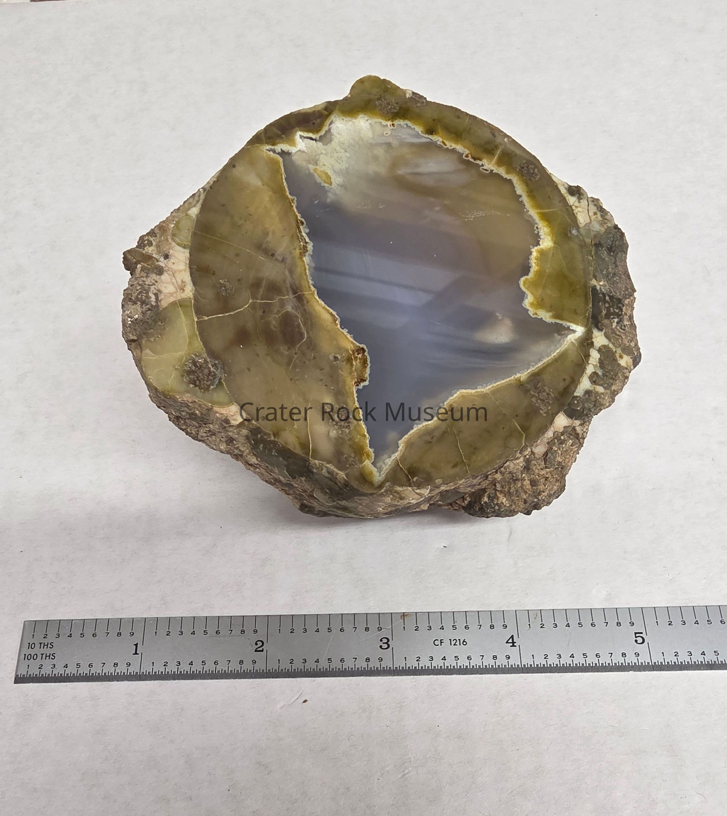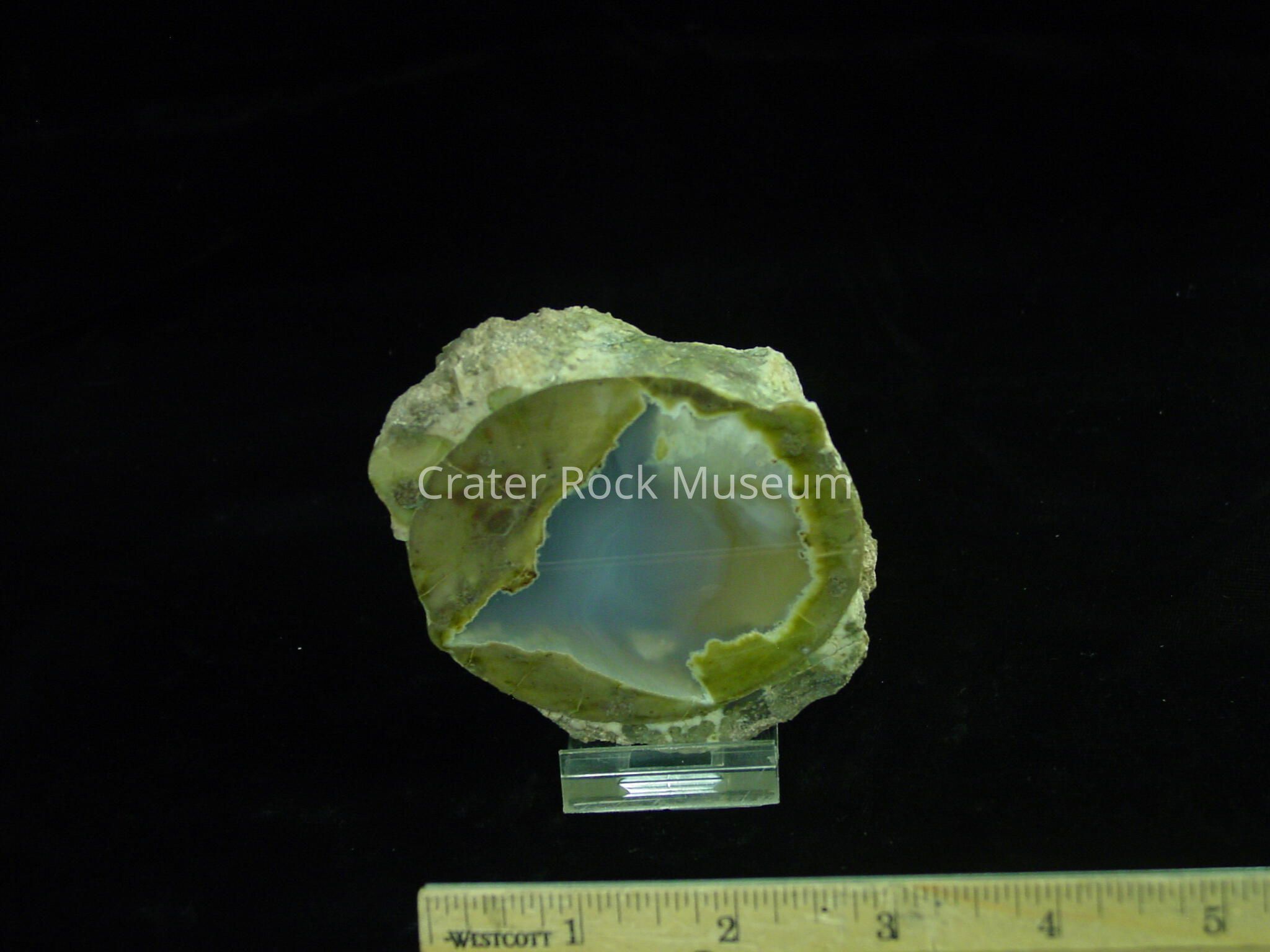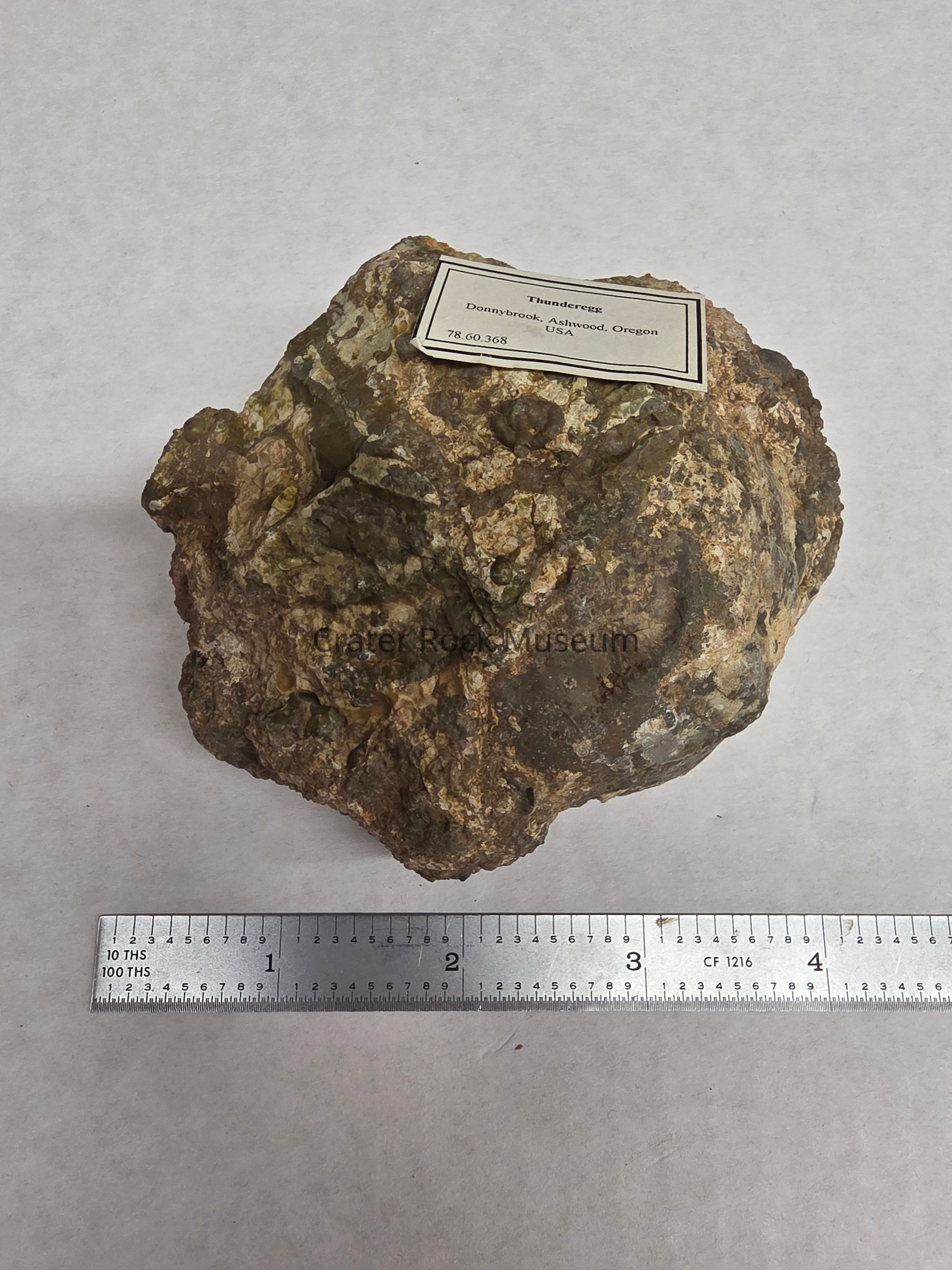 Description: A thunderegg from Donnybrook, Ashwood,OR. Cut side shows grey agate center surrounded by circular olive green colored rock area with some grey, pinkish and green rock. yellowish and gray rock with some reddish color.Collection