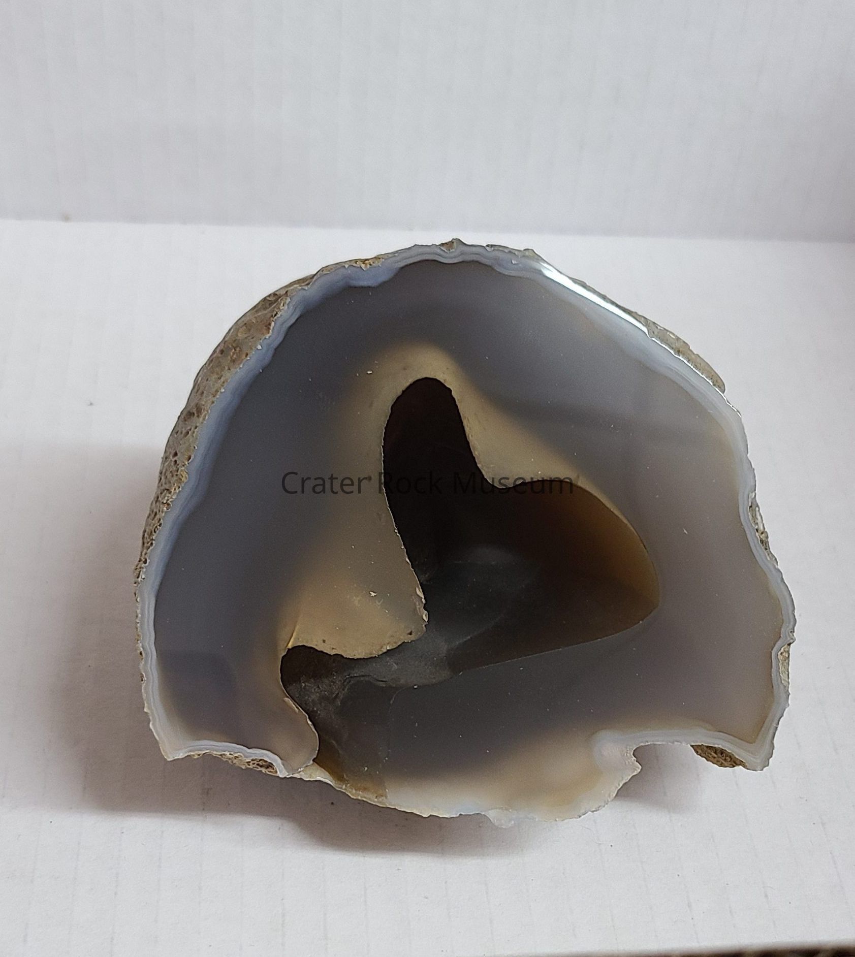 Description: Thick rounded back with polished face. Deep translucent gray with a light brown section surrounding a cavernous, hollow dark gray center.