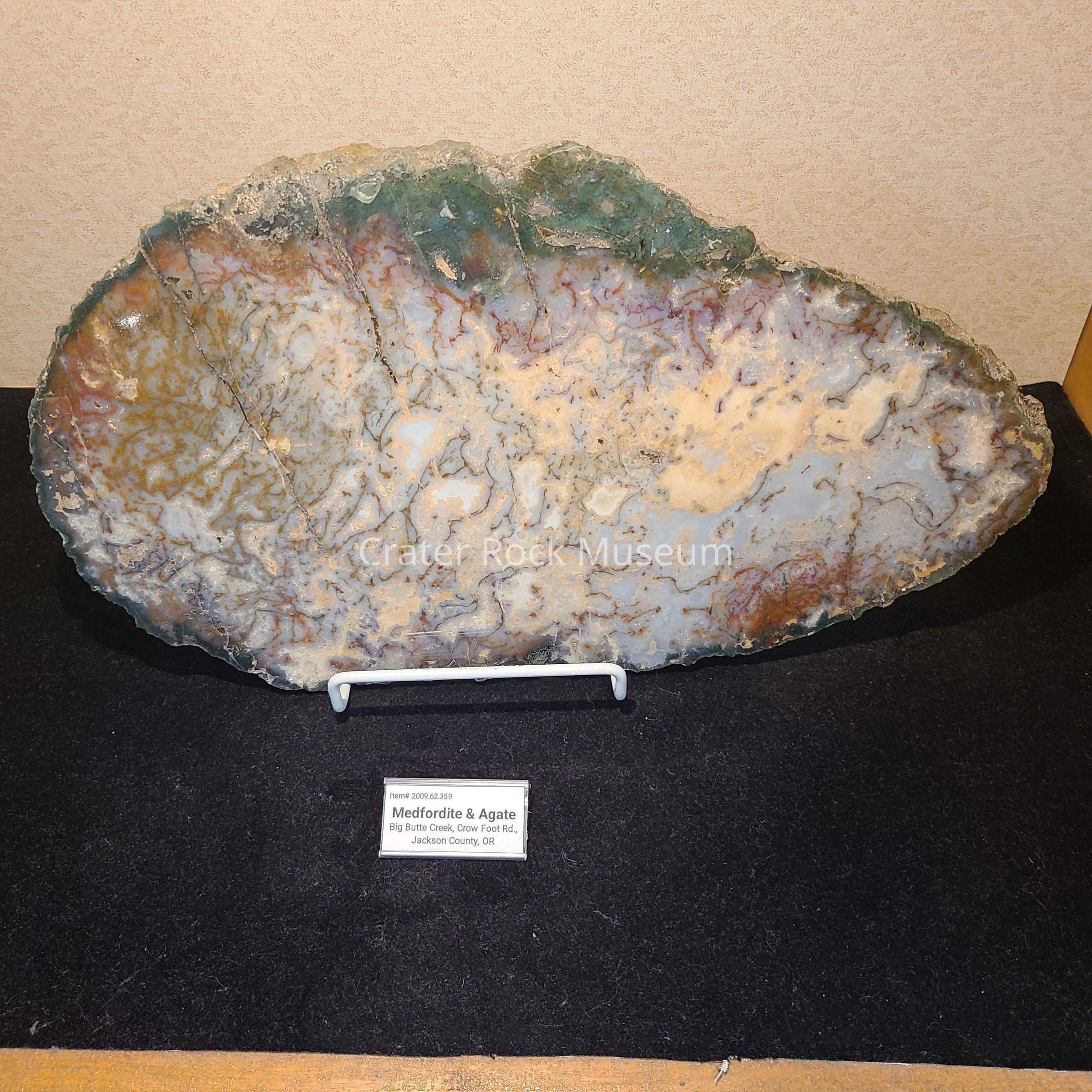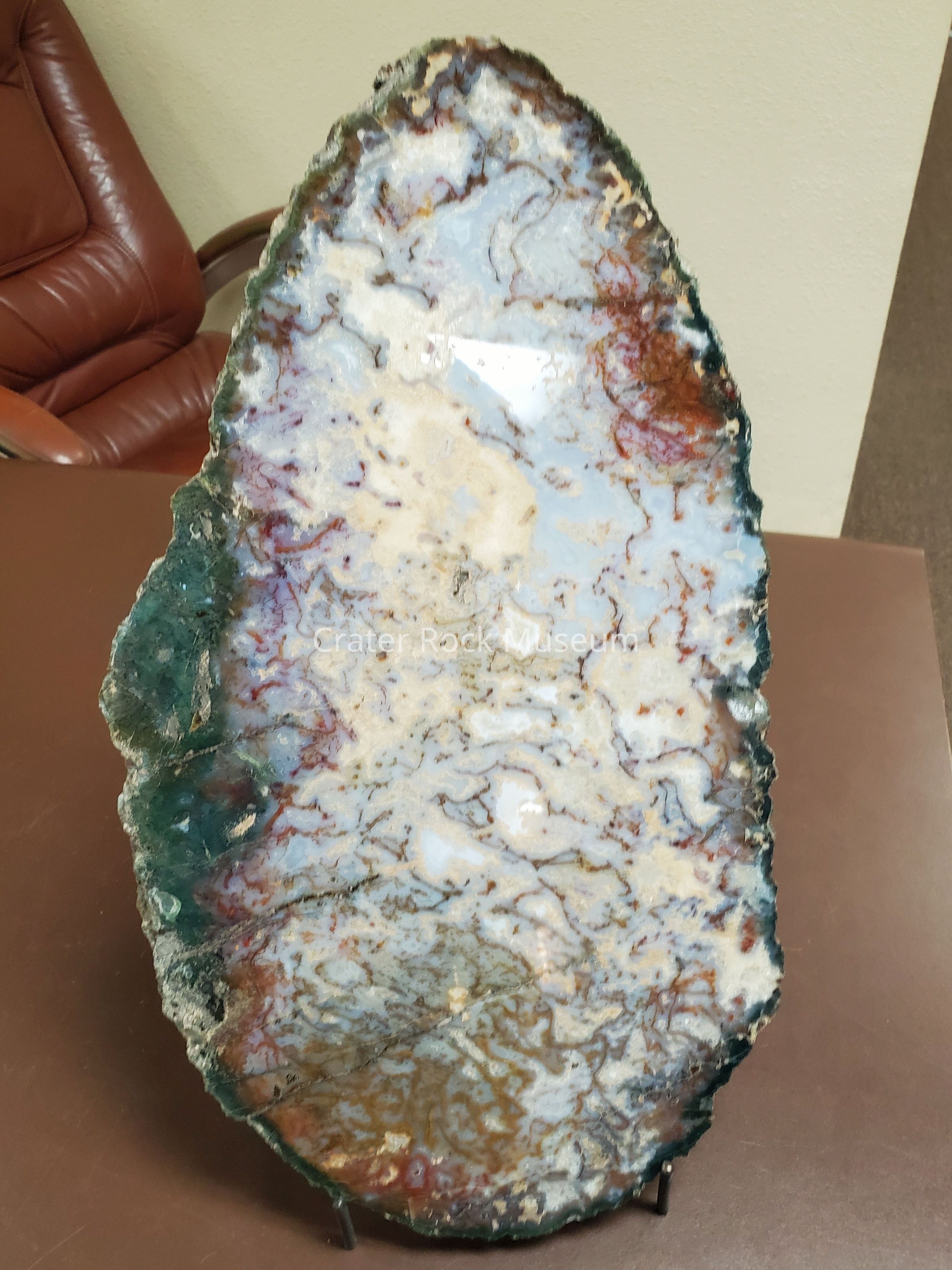 Description: Large thin slab with polished face. Dark green on outer edges with creamy gray and yellow in the main body in an irregular pattern with dull red streaking throughout the specimen.Collection