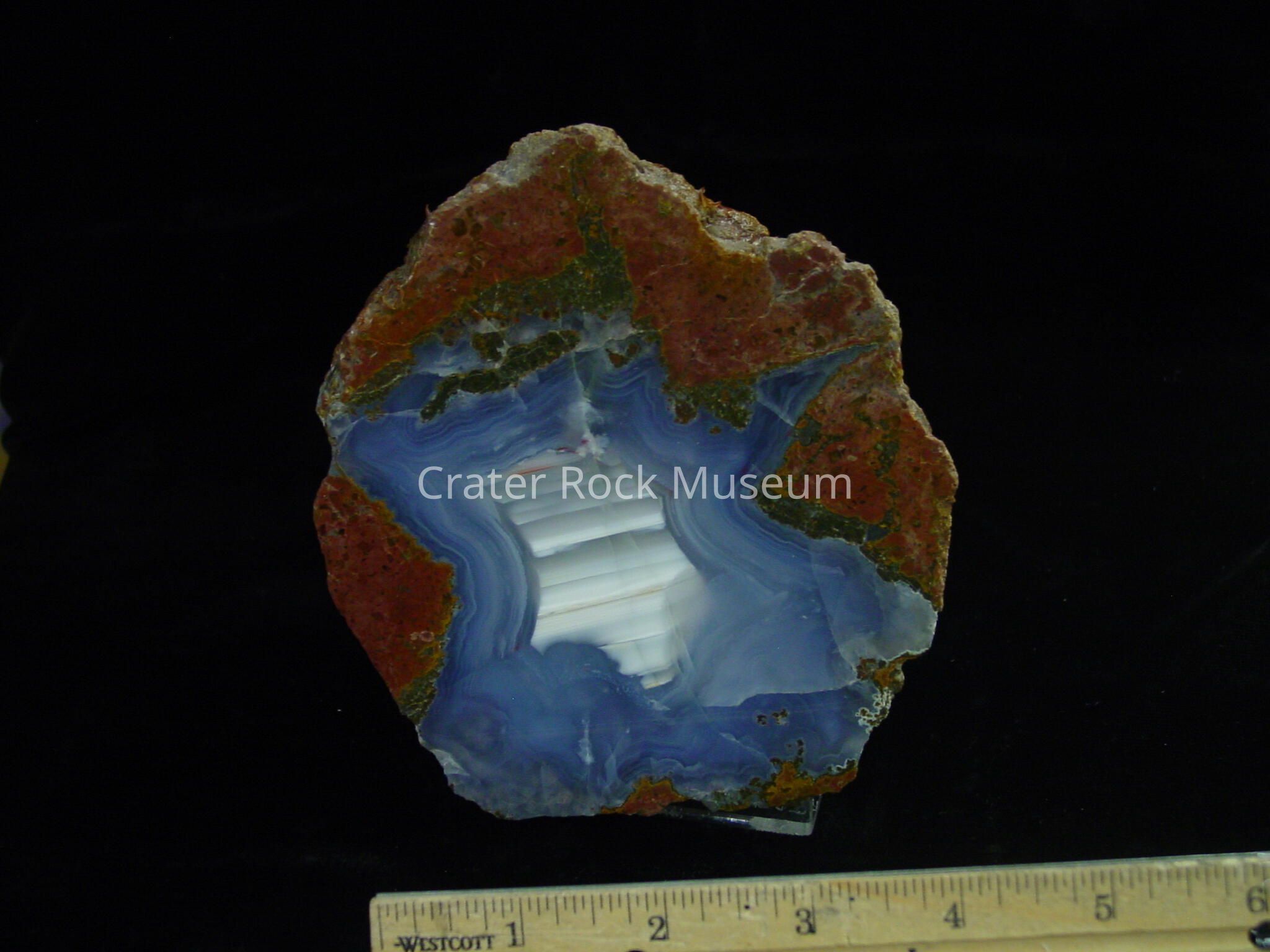 Description: Light to dark grey agate with white bedding lines in the center. The rock surrounding is reddish brown and dark grey in color.Collection