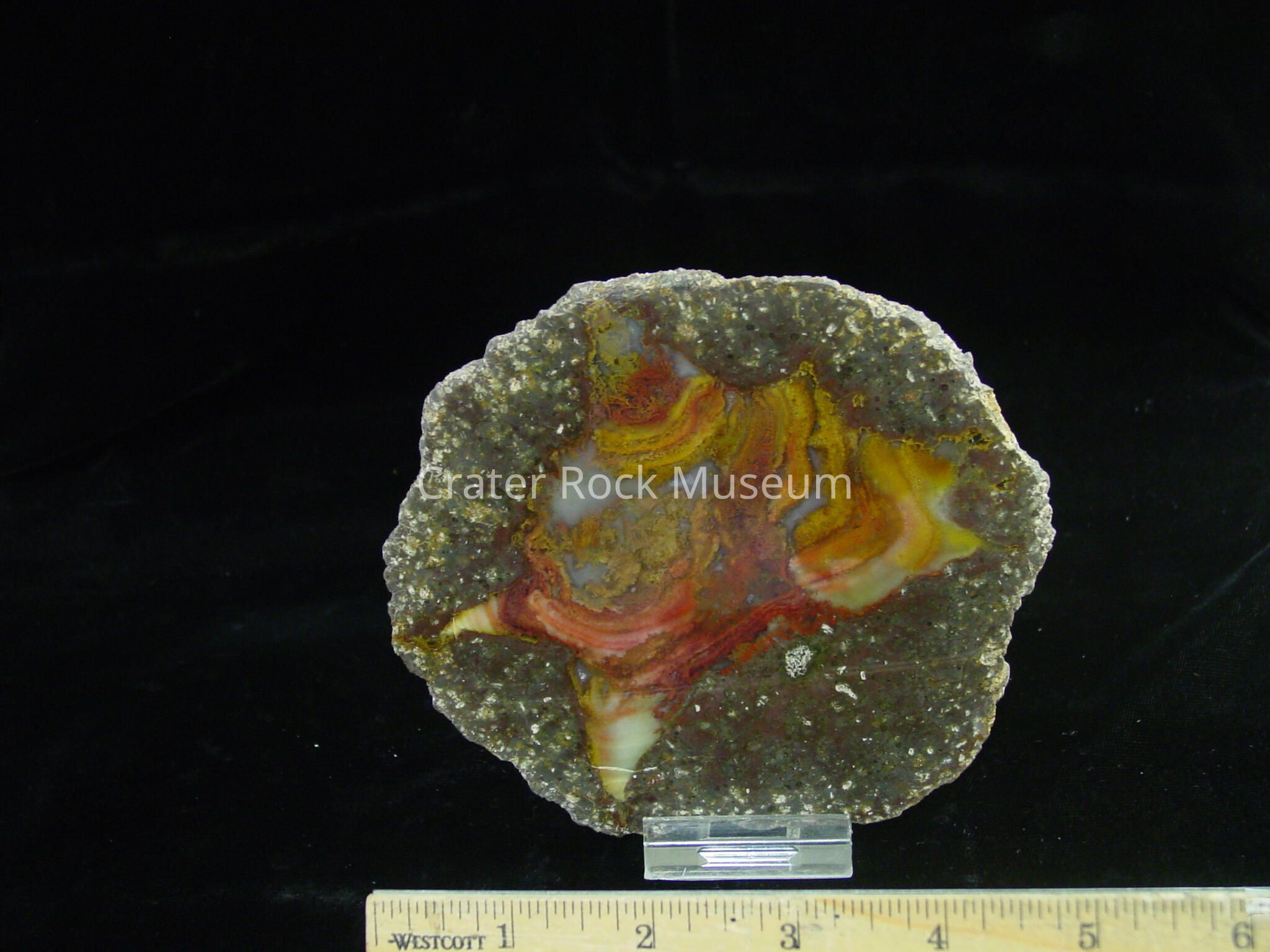 Description: A thin slice of thunderegg with a star shaped center of moss agate in clear, yellow, mustard, reds and creams. Outer rock is dark grey and brown with some white specks.Collection