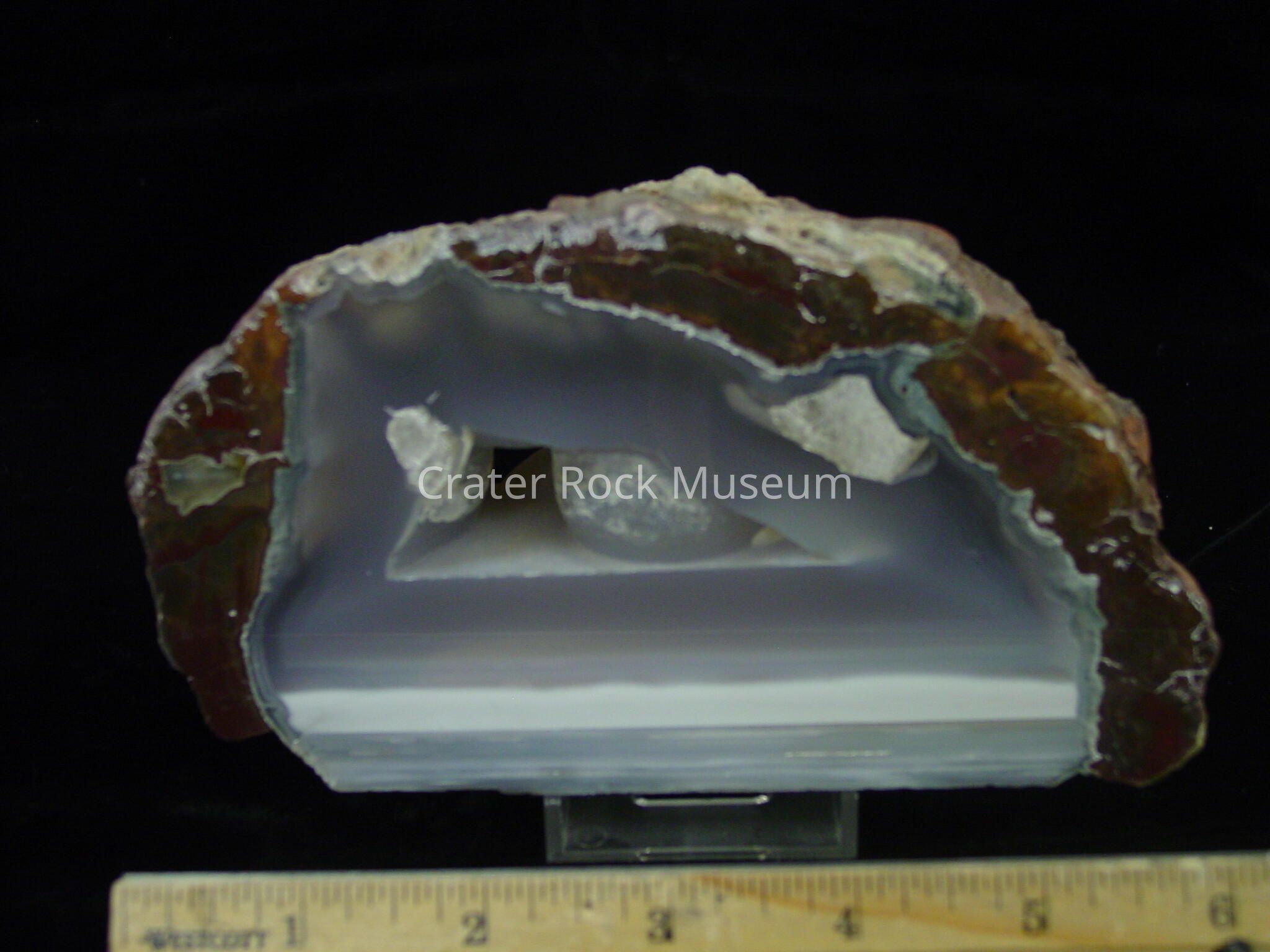 Description: Polished side of a slice of thunderegg shows a grey agate bubble ( only one ever found by Delmar Smith) . There is fortified and bedded agate in blue-greys, blues and white.