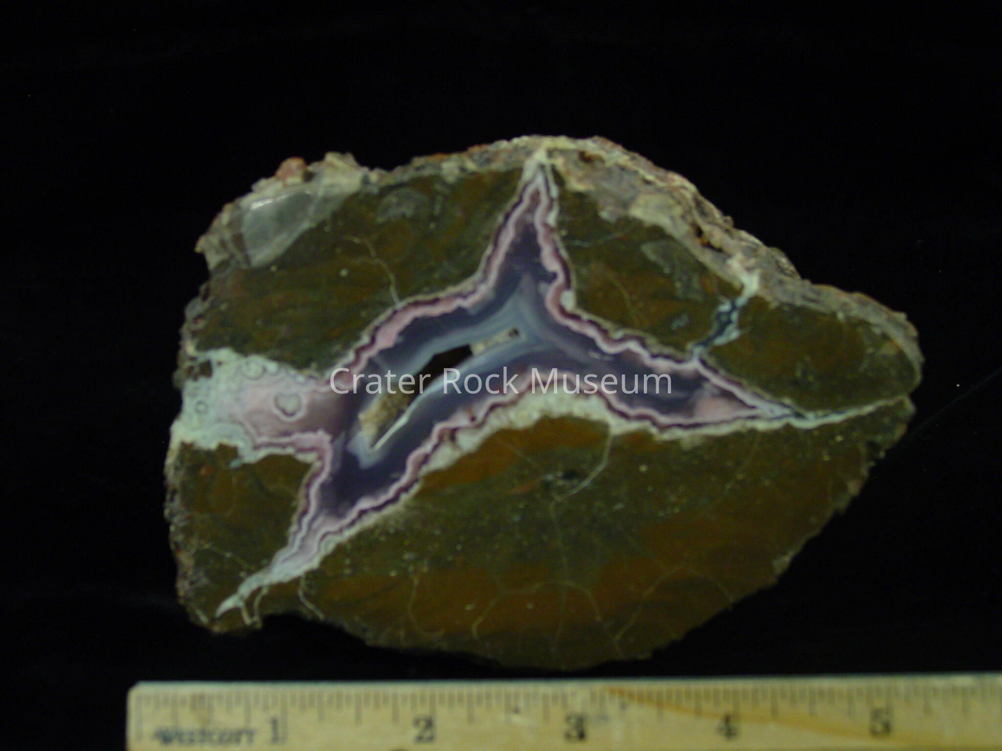 Description: This thunder egg has a clear and purplish agate center with a small opening. This is surrounded by a band of pink and white. Surrounding rock is a reddish brown.Collection