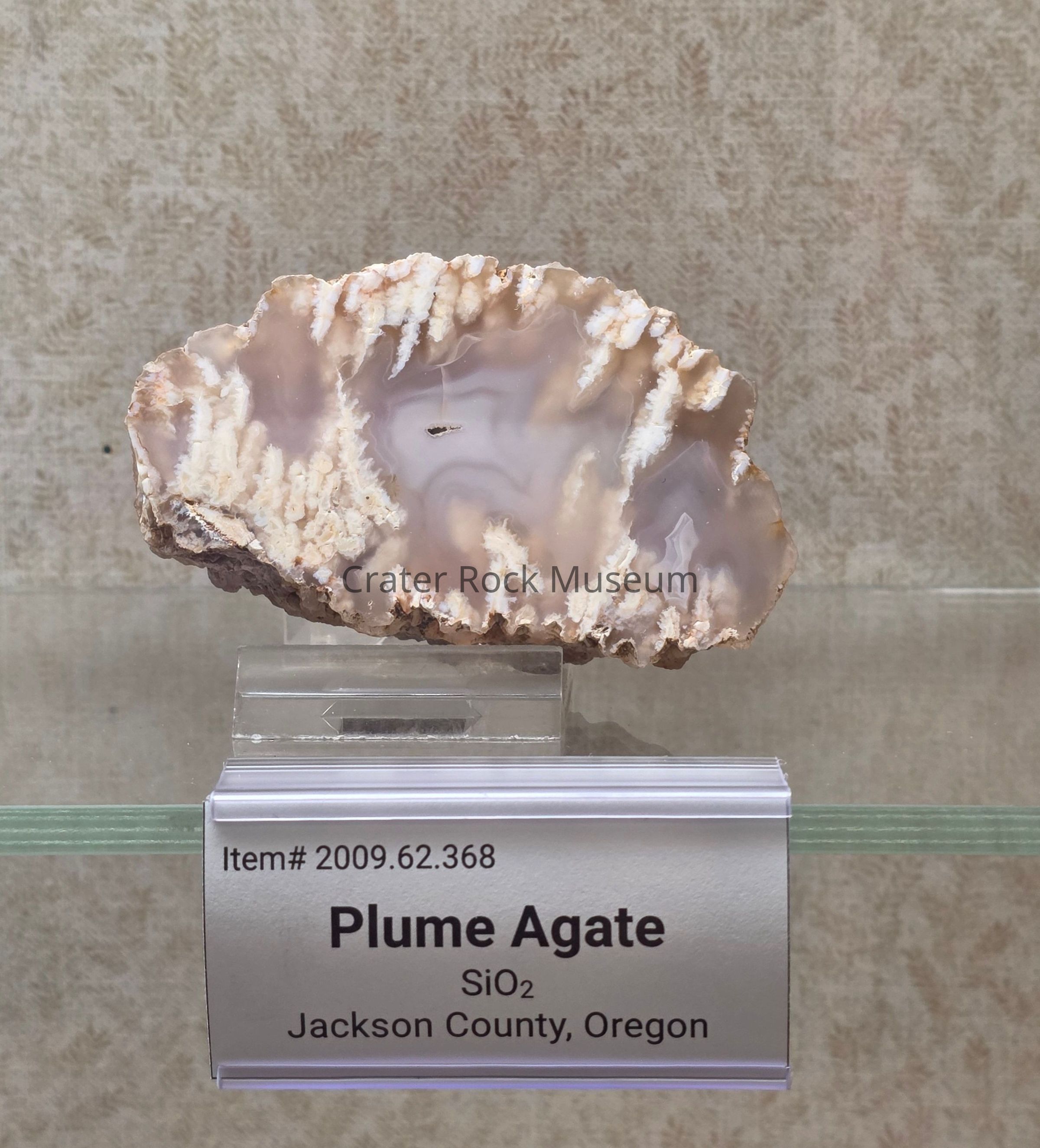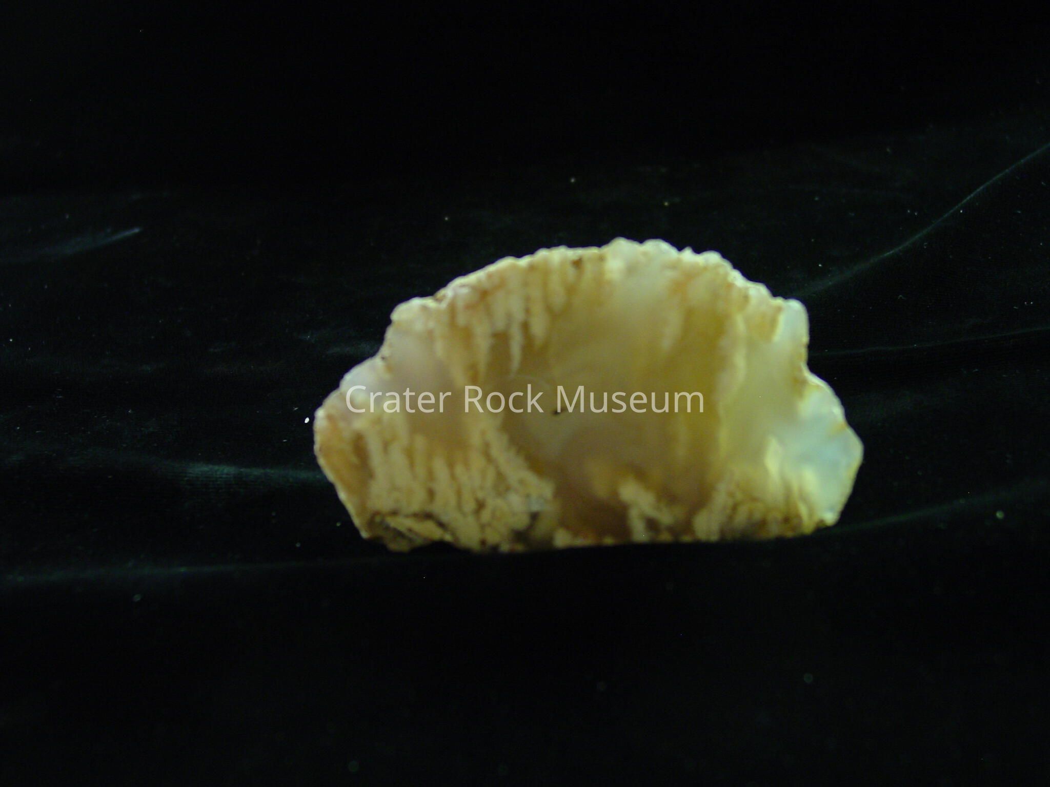 Description: Small, thick rounded, porus back with polished face. Transparent light brown and tan throughout with columnar, dendritic structures penatrating in a somewhat parallel direction.Collection