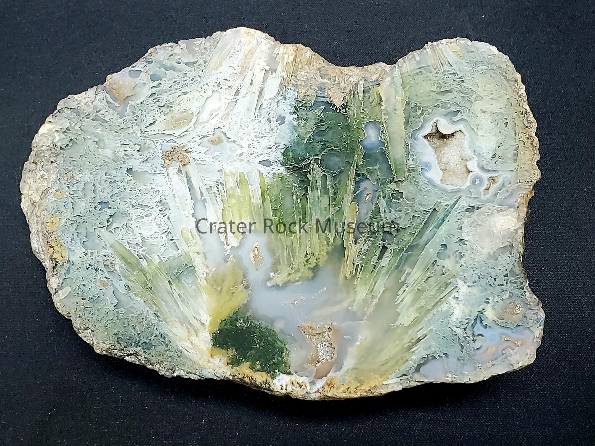 Description: Thin slab with rounded back and polished face. Transparent grays, light and dark olive greens in a porous (polished) matrix, almost with a spongy appearence with green crystals (shooting out), from a common point.